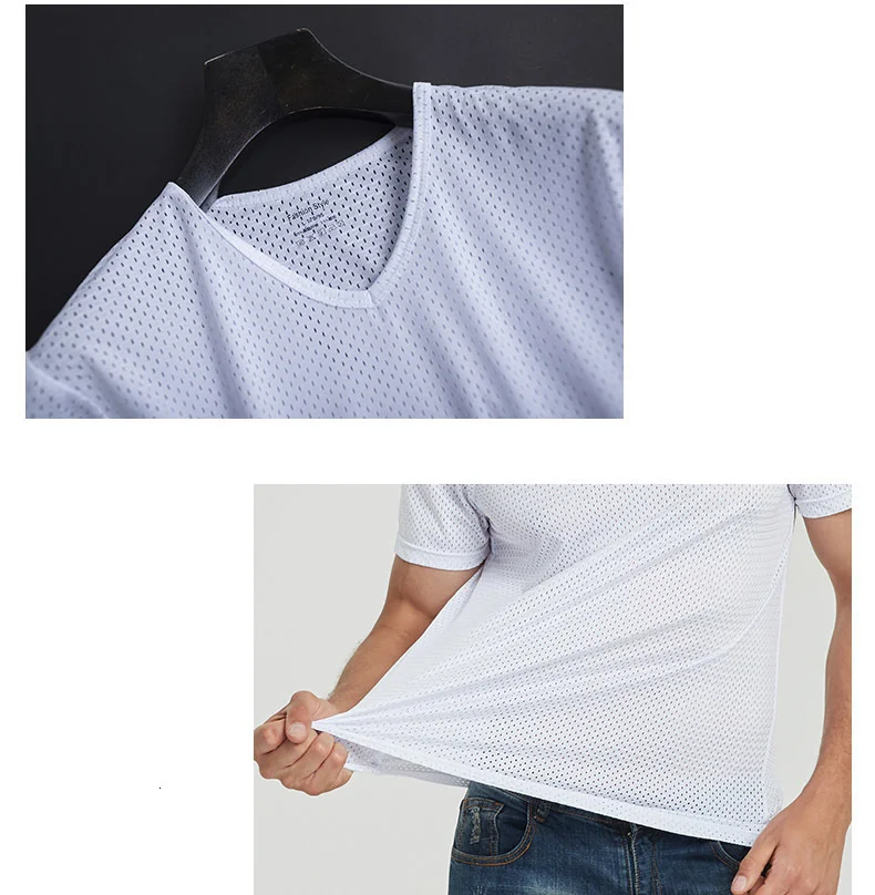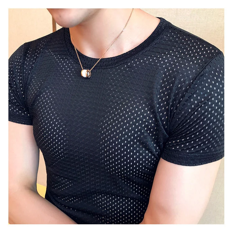 Футболка мужская с перфорацией, пикантная прозрачная сетчатая рубашка с коротким рукавом, повседневный топ для фитнеса, размера плюс 4XL, лето 2021