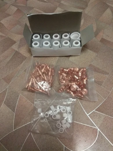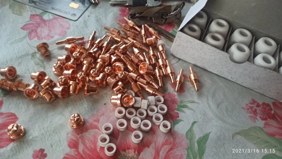 Перед заказом общался с продавцом, сказал, что для herocut 50i подойдёт, тк резак PT-31. Подумал будут удлинённые, не знал как выглядят, т.к. заказывал не имея ещё плазмореза за 1102.11руб со скидками от 22.12.20, заказ получил 2.02.21. Пришёл простой пакет с зажимом, изнутри грязный и порван на дне, и коробочкой.