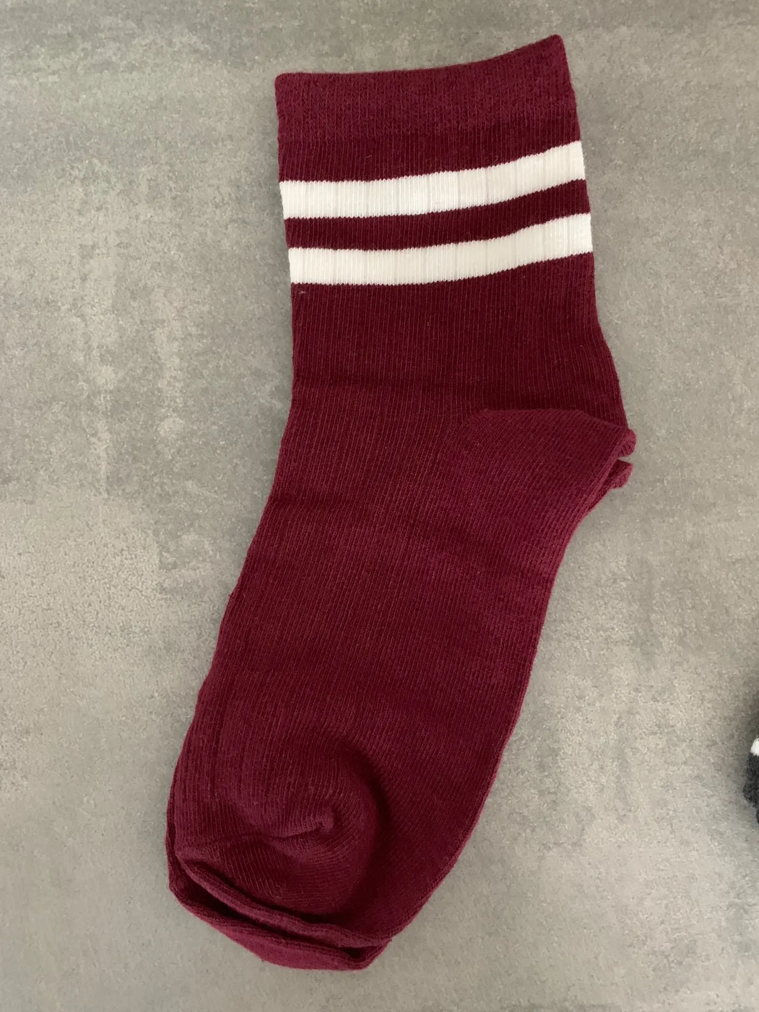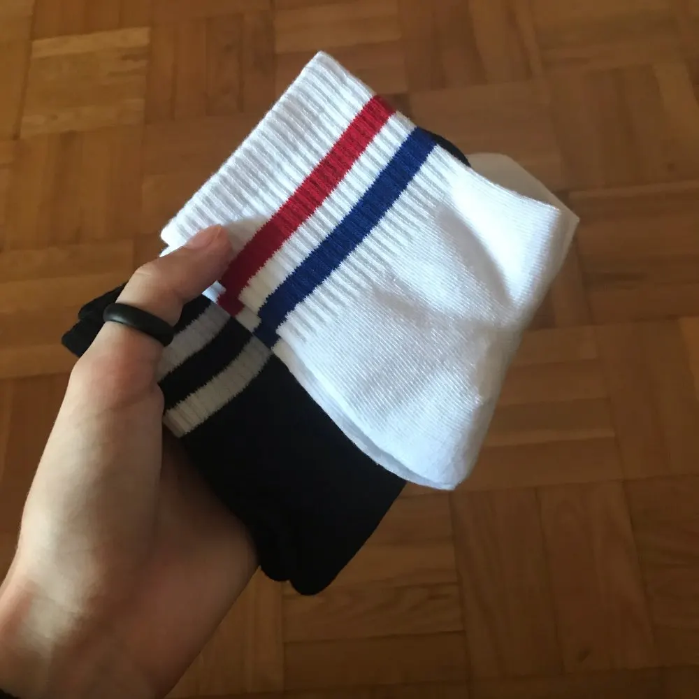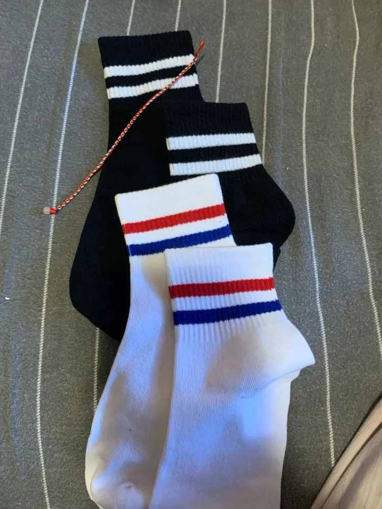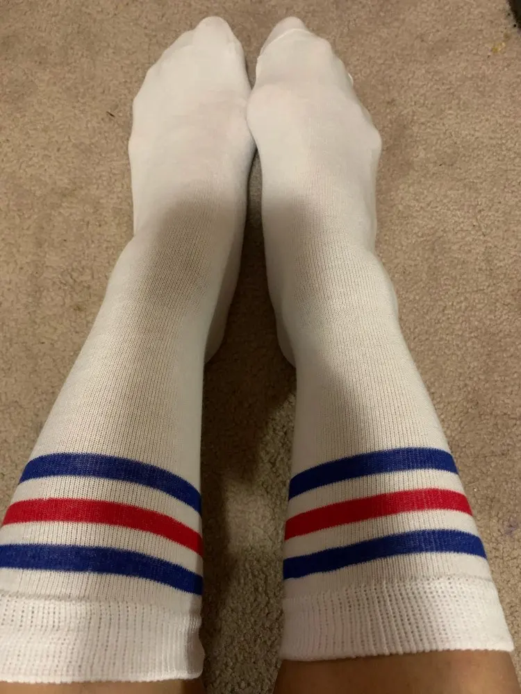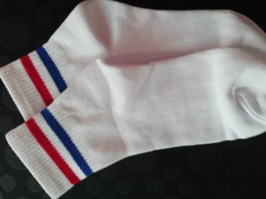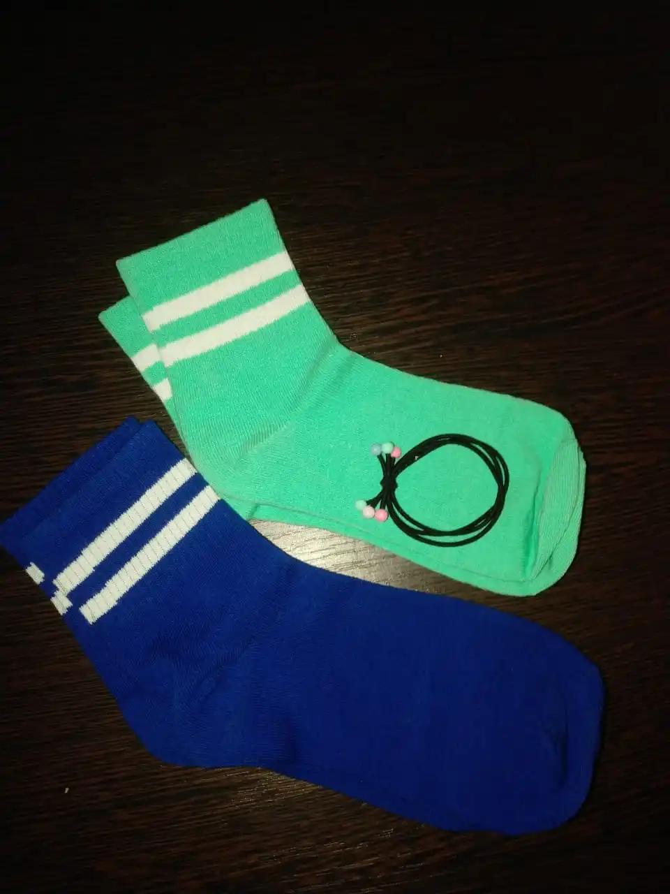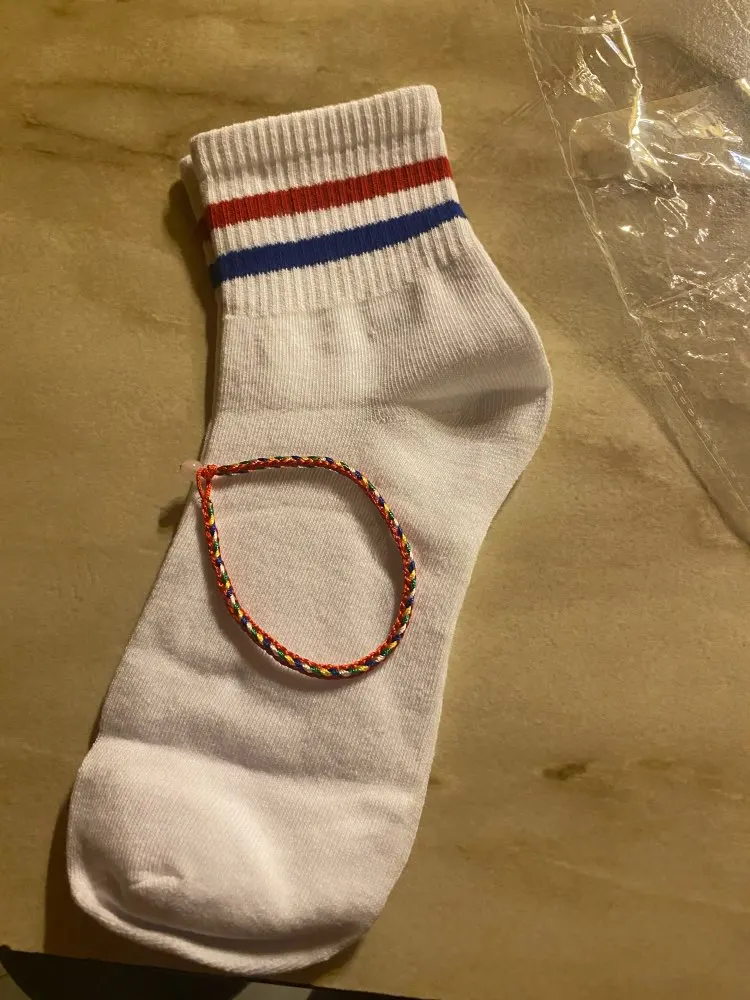 Отличные носки! Приятные, размер на 38,5 идеально, но они прекрасно тянутся, подойдут для широкой щиколотки, материал похож на хлопок, хороший, продавец положил ещё браслетик в подарок. Рекомендую. Цвета как на картинке, полоски яркие, сами носочки белоснежные. Посылка пришла оч быстро в Питер.