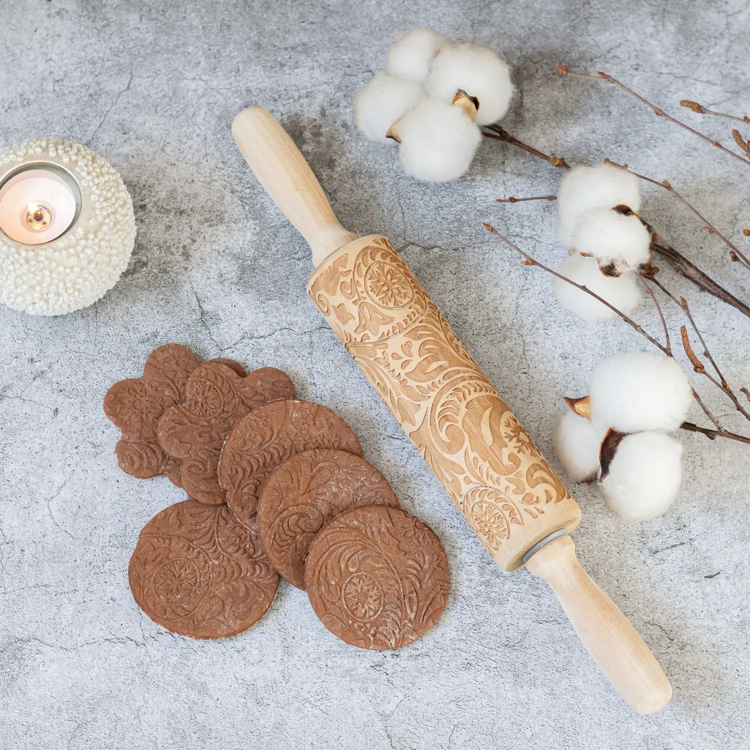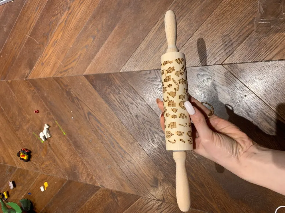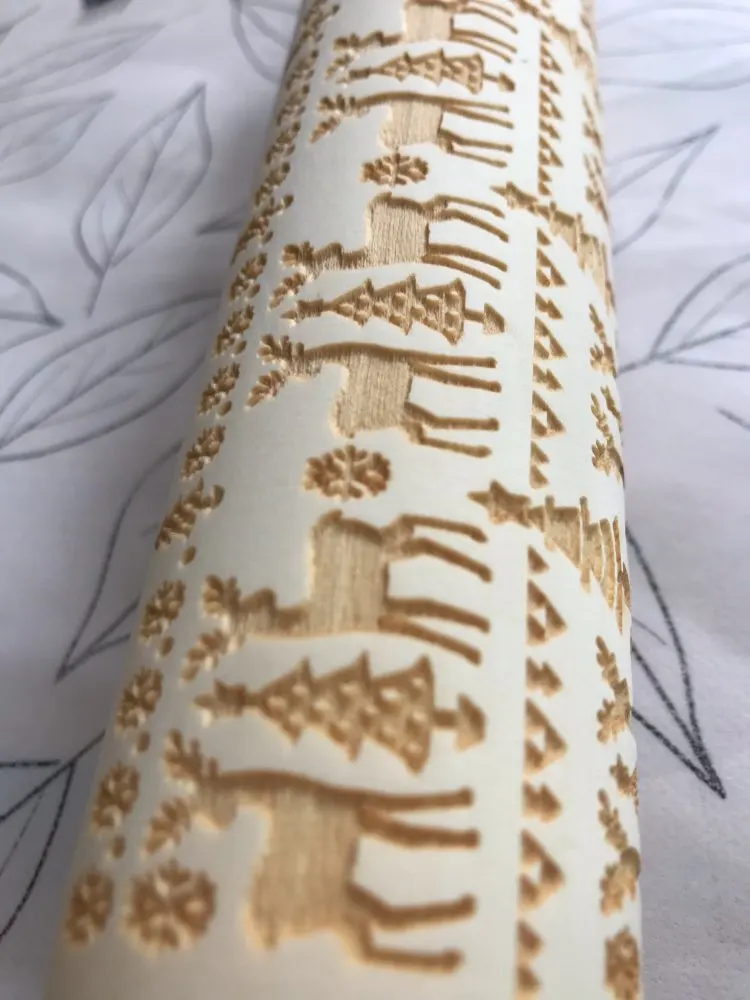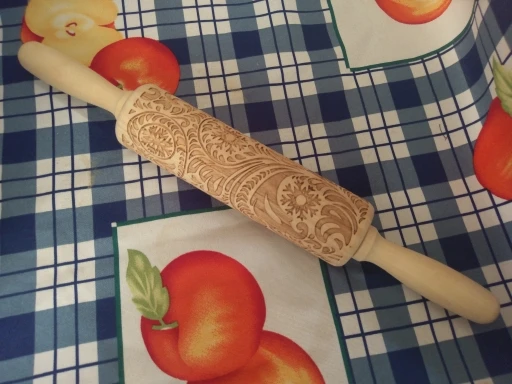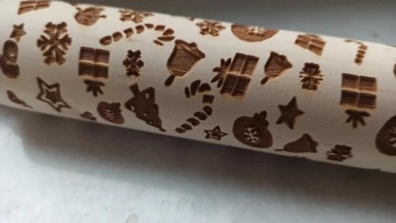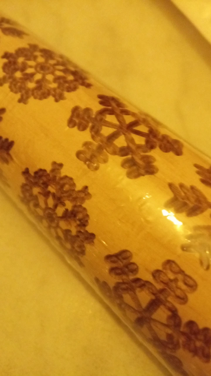 Скалка с красивым узором из листьев и цветов, глубина рисунка чуть больше миллиметра. Опробую в новогодние праздники, на вид качественная. Спасибо.