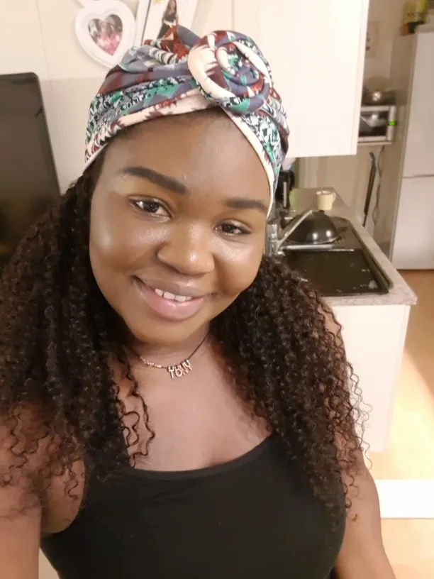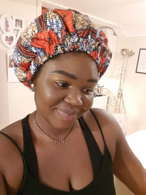 Точно как на фото. Немного туго, поэтому немного хлопот, чтобы держать волосы одной рукой и надеть тюрбан с другой. Я доволен этим, хороший материал футболки