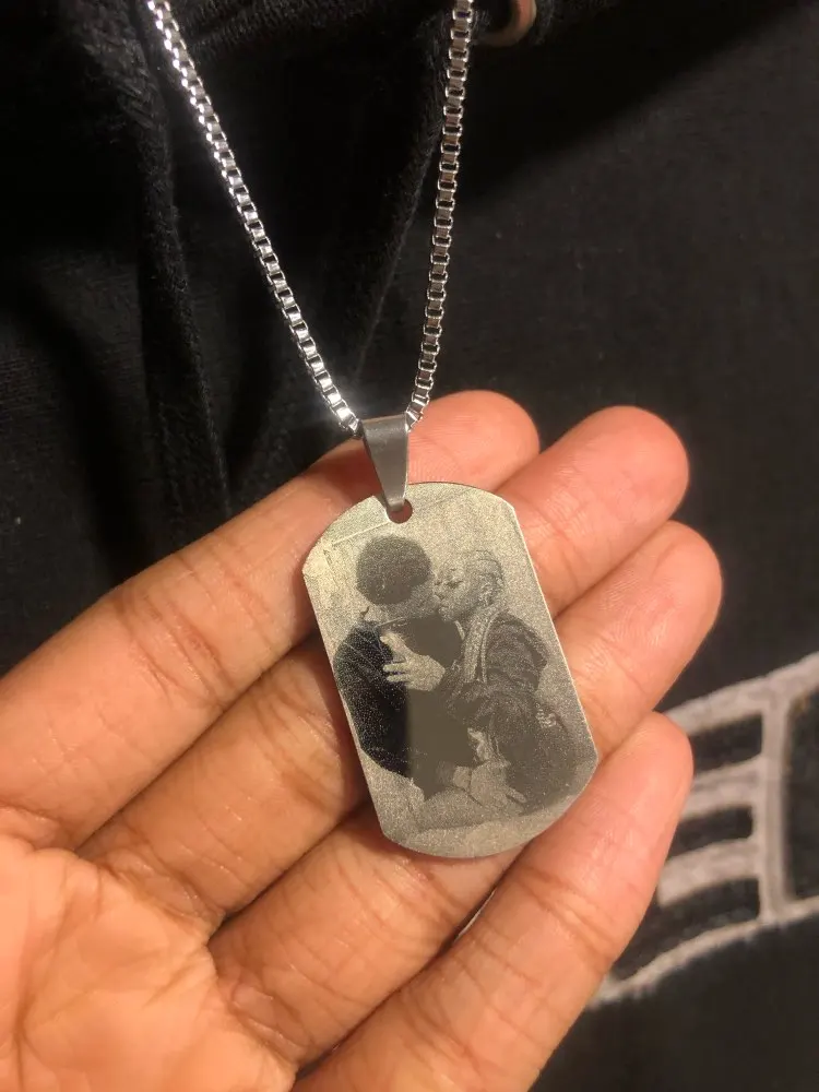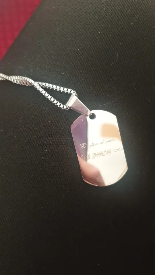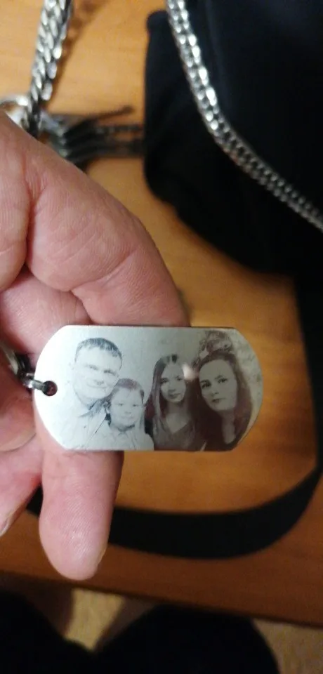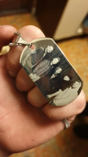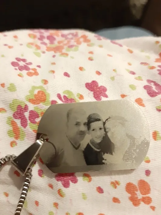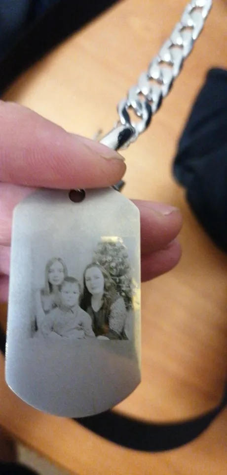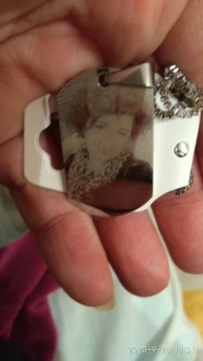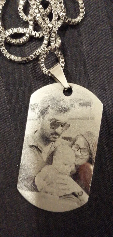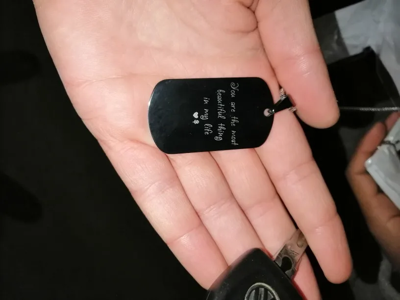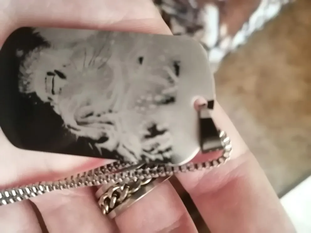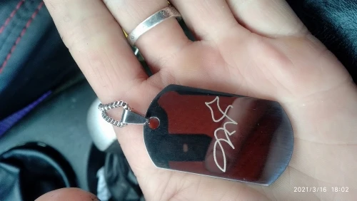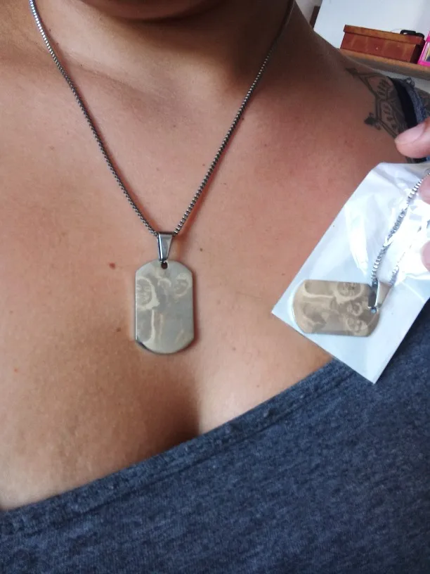 Потрясающий продукт, как неуверенный первый заказ, вы не уверены, основываясь на фотографиях других людей. Он действительно опускается на угол и освещает, что вы смотрите на него. Единственный отрицательный элемент-металлический элемент, который удерживает бирки на цепочке, так как он просто Согнут на место, но это также позволяет легко удалить бирки и поместить их на свою цепь. Изображение четкое, гравировка отличного качества и была доставлена раньше, чем ожидалось.