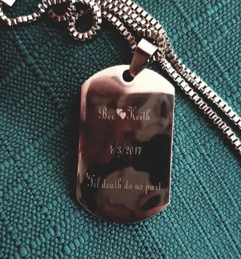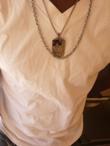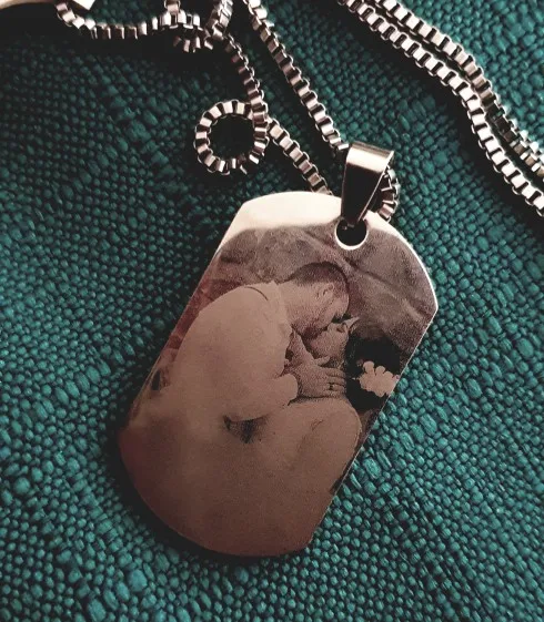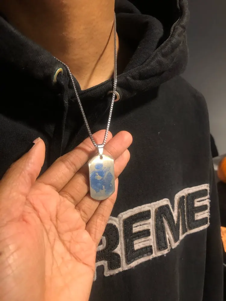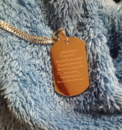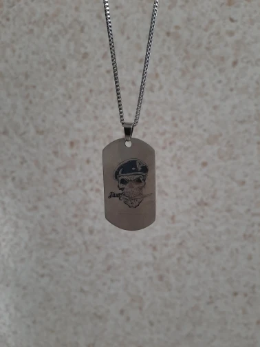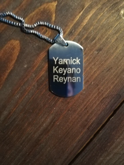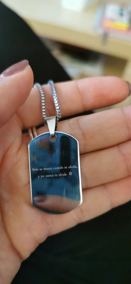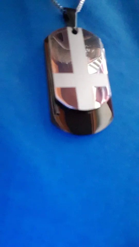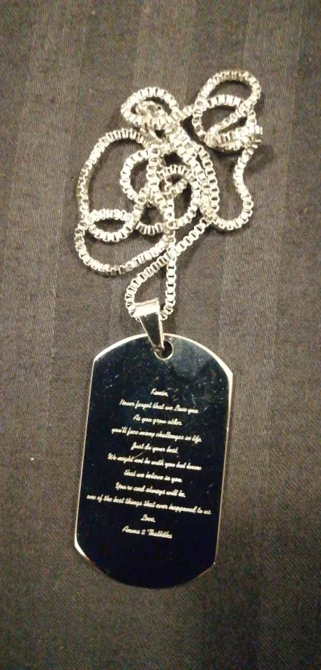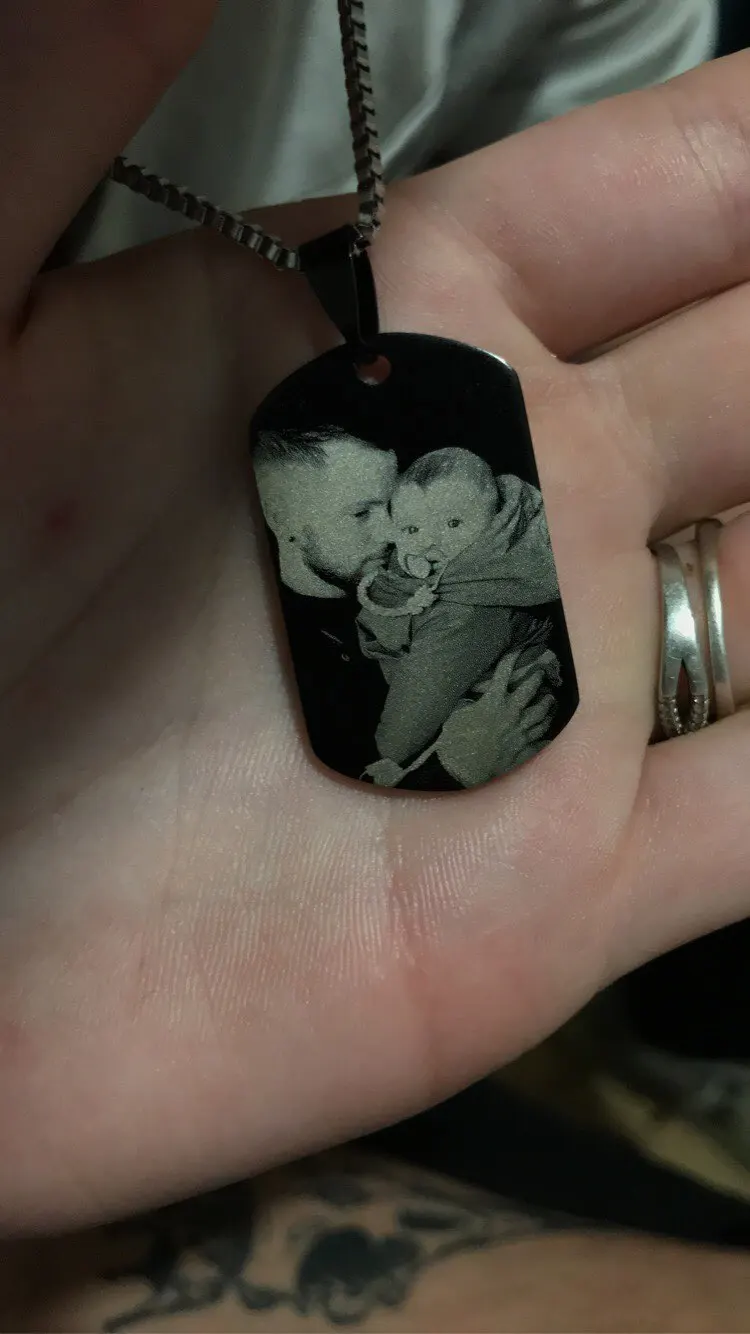 Потрясающий продукт, как неуверенный первый заказ, вы не уверены, основываясь на фотографиях других людей. Он действительно опускается на угол и освещает, что вы смотрите на него. Единственный отрицательный элемент-металлический элемент, который удерживает бирки на цепочке, так как он просто Согнут на место, но это также позволяет легко удалить бирки и поместить их на свою цепь. Изображение четкое, гравировка отличного качества и была доставлена раньше, чем ожидалось.