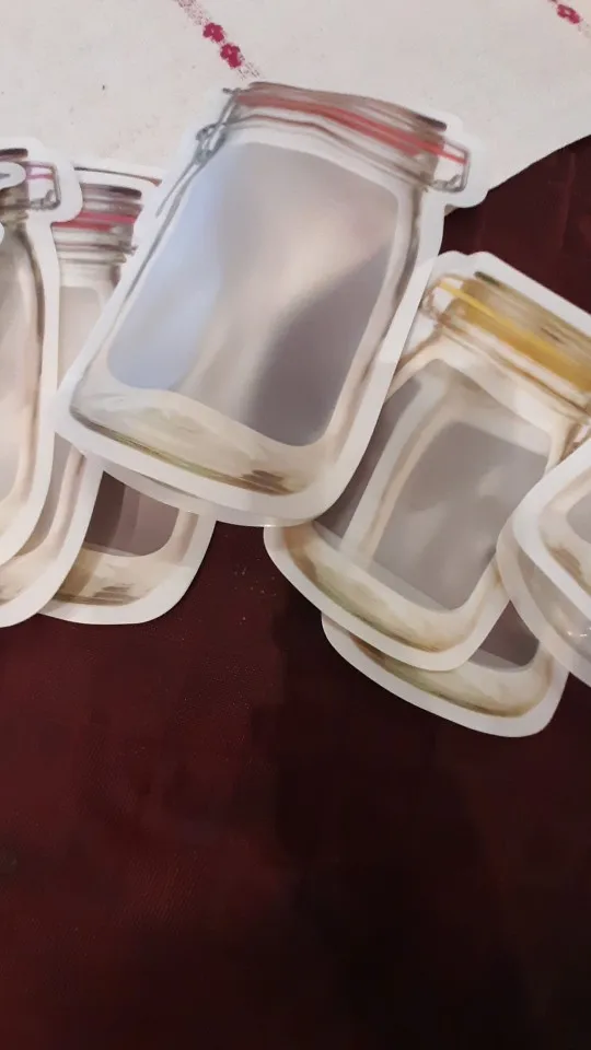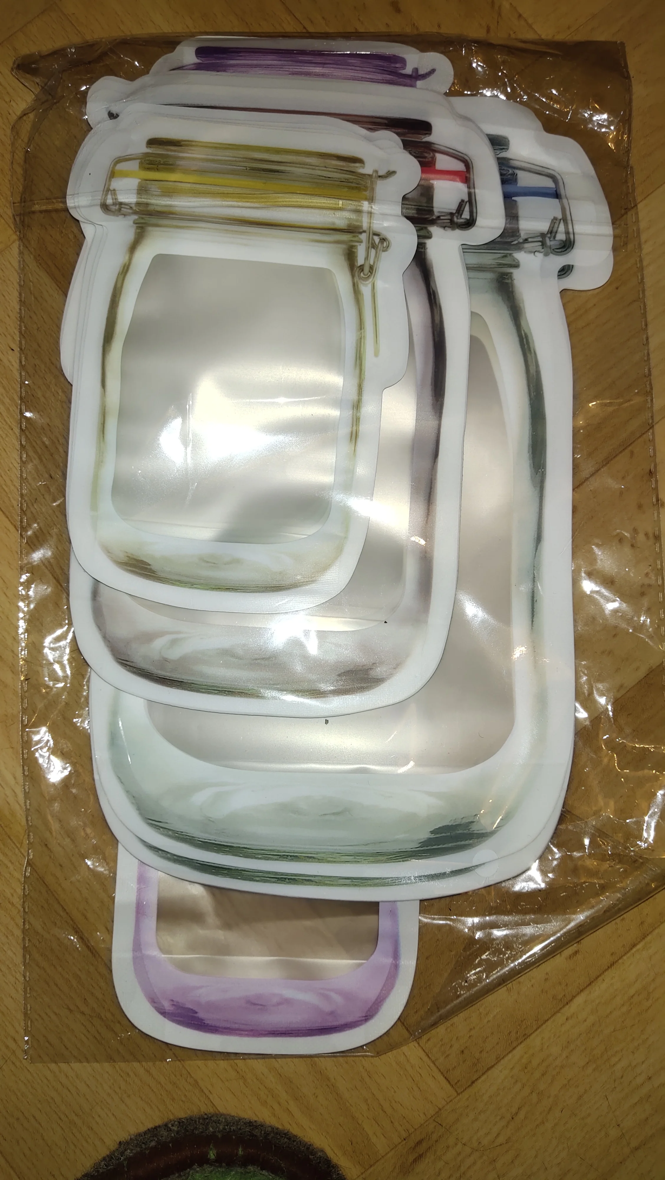 очень долго шли,приятные мешки- ёмкости для продуктов в виде банок,плотный целлофан.