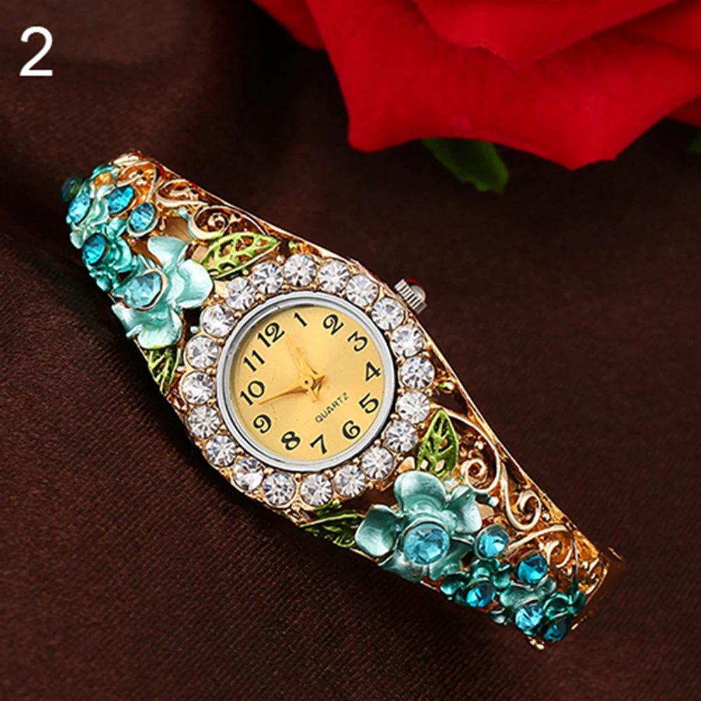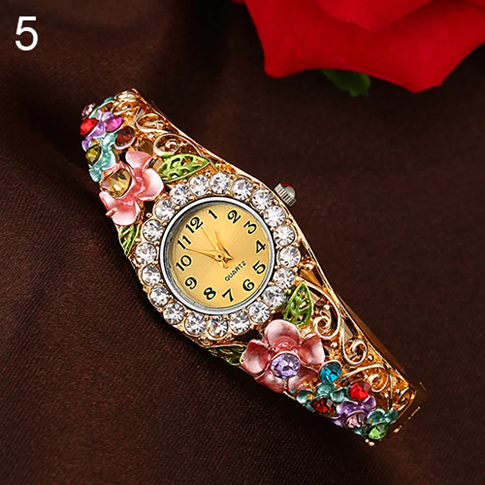 Модные женские часы, популярные брендовые роскошные женские часы с красивым цветком, браслет с вырезами, кварцевый браслет с кристаллами, ювелирные изделия