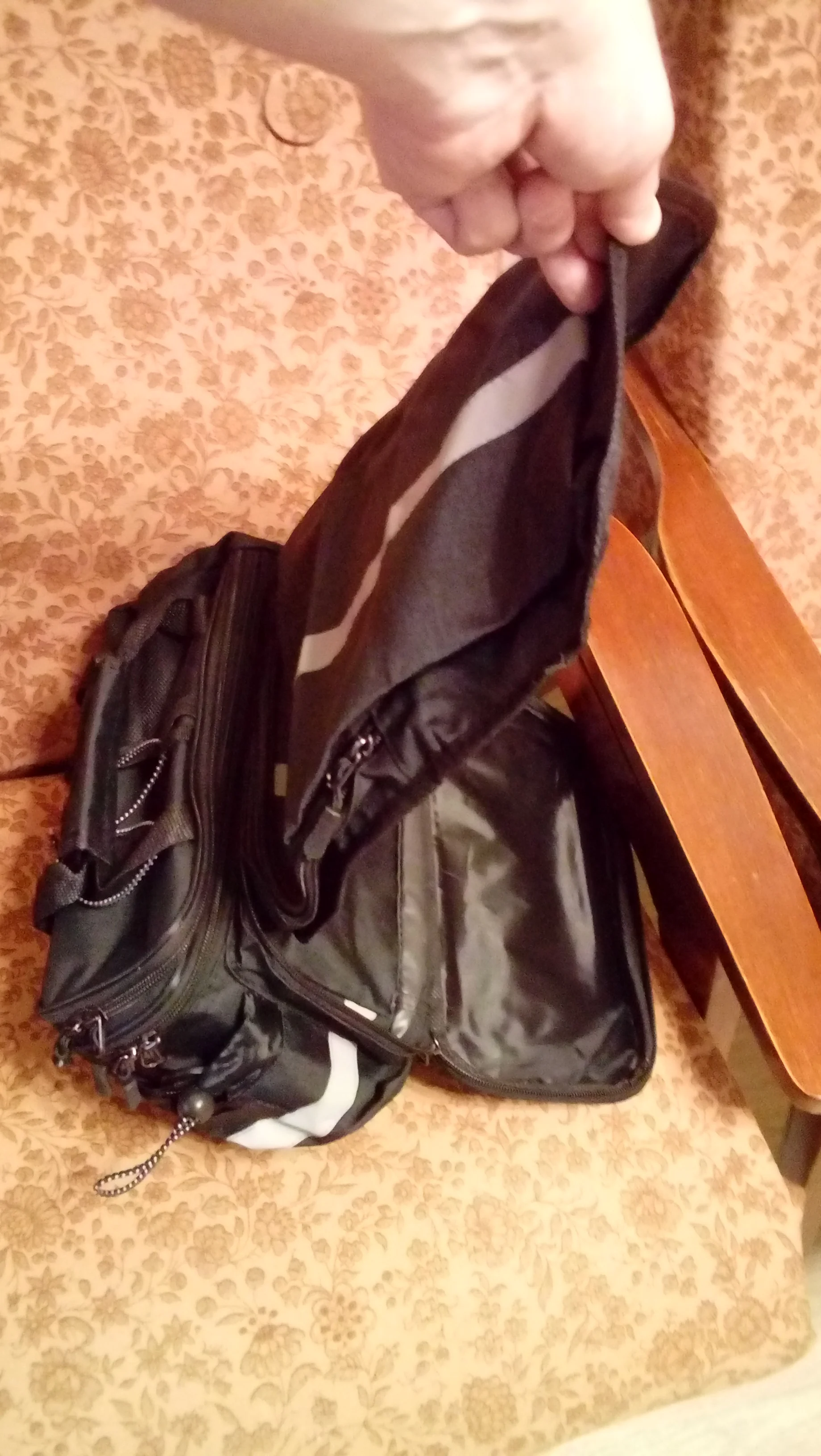 Размеры развернутого бокового кармана (штанины) 40х270х340 мм. Боковые карманы пришиты одним швом сверху. Хочу сделать на боковых карманах еще швы по бокам для надежности. Вес сумки около 0,7 кг. Отличная сумка для езды на велосипеде, которую не жалко.