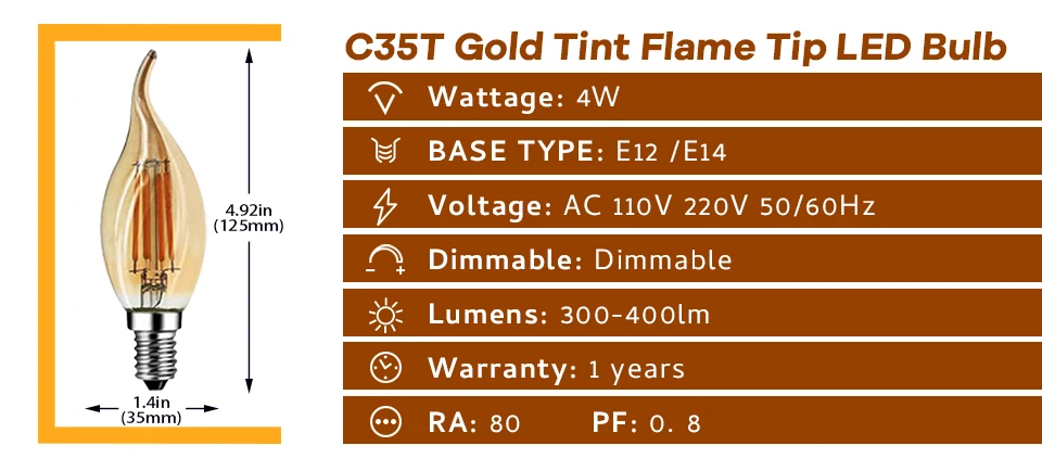 Страна: IL Emitting Color: 2200K 5pcs Color: Gold Tint Number of LED Chip: 4 Chip Wattage: 4W E14 220V Support Dimmer: Yes Доставка: Standard Shipping 05.08.2021