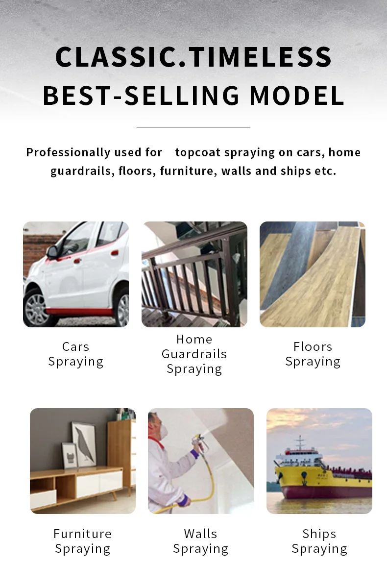 Все модели, расстояние распыления 200 мм.Профессионально используется для напыления верхних плащей на автомобилях, домашних ограждениях, полу, мебели, стенах и кораблях и т. д.Распыление автомобилейРаспыление домашних огражденийОпрыскивание половРаспыление мебелиРаспыление стенРаспыление кораблей