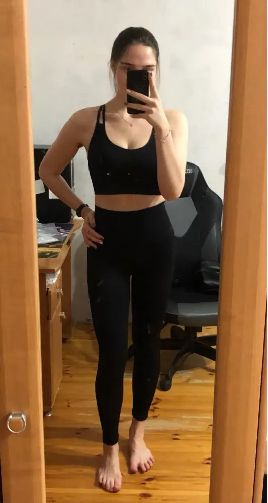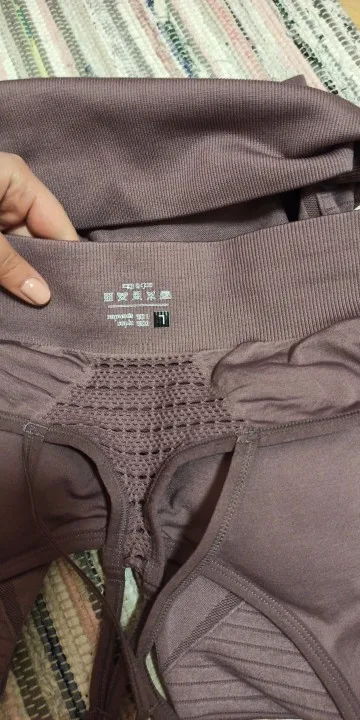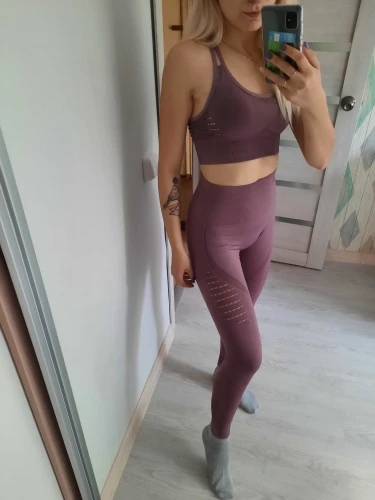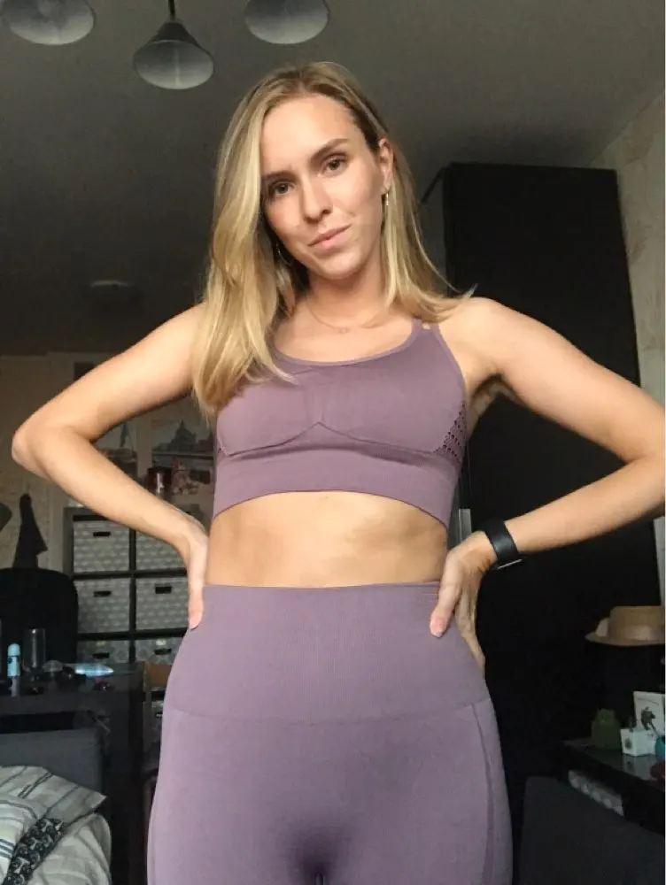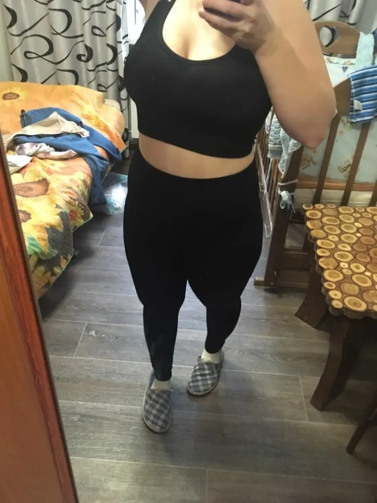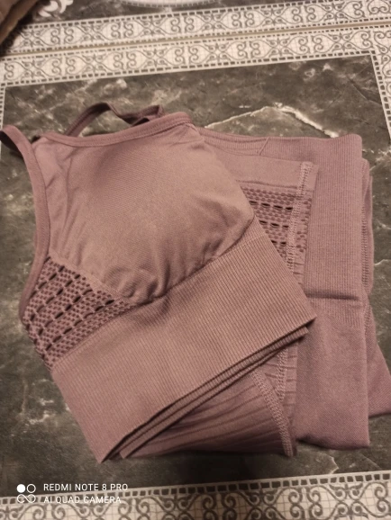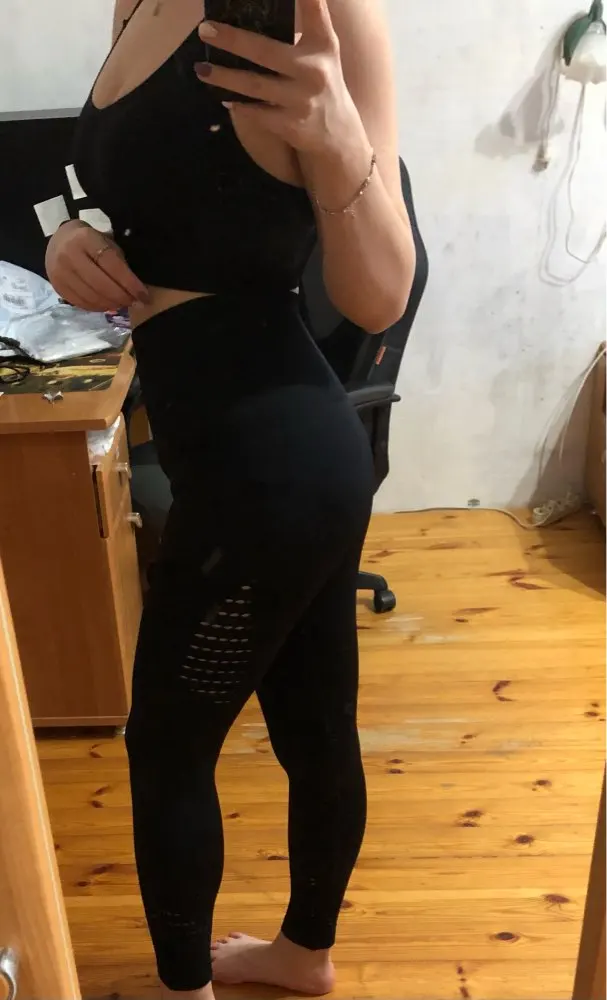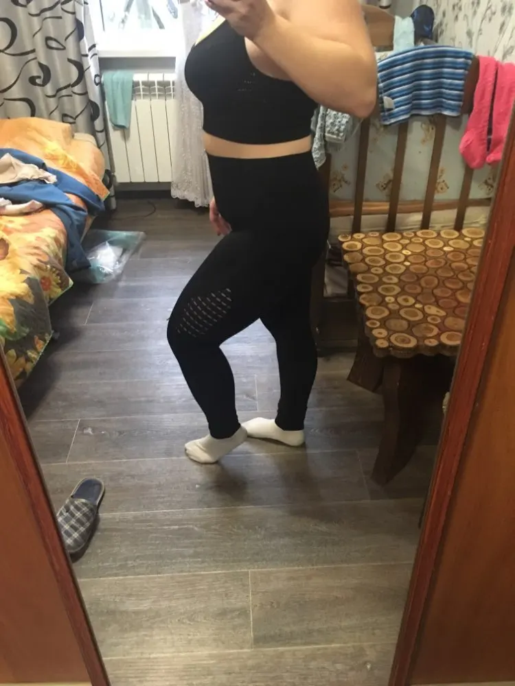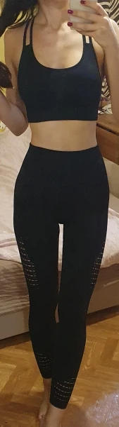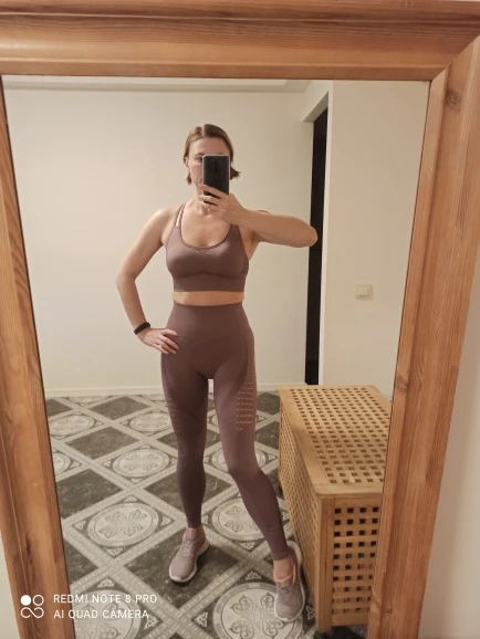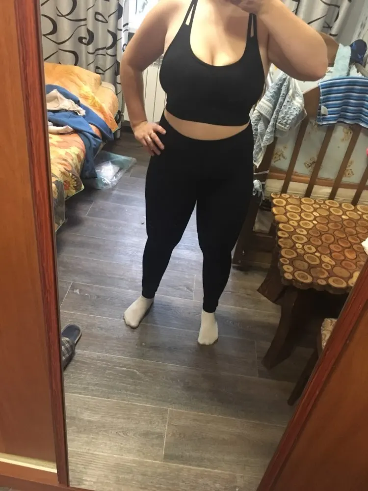 Честно говоря, не ожидала такого качества. Ткань очень плотная, хорошо утягивает, ничего не просвечивает. Брала размер М на рост 160, об95 от65. Село как надо, в талии не свободно, как бывало с некоторыми другими штанами для йоги. Майка тоже понравилась. Единственное - сбоку из перфорации немного видны чашечки. Но для меня это некритично.