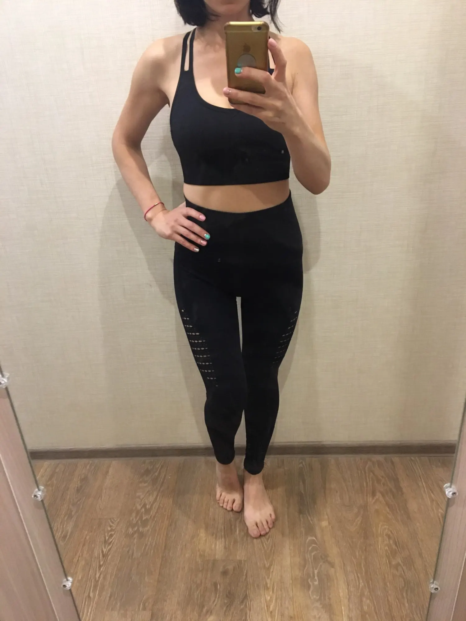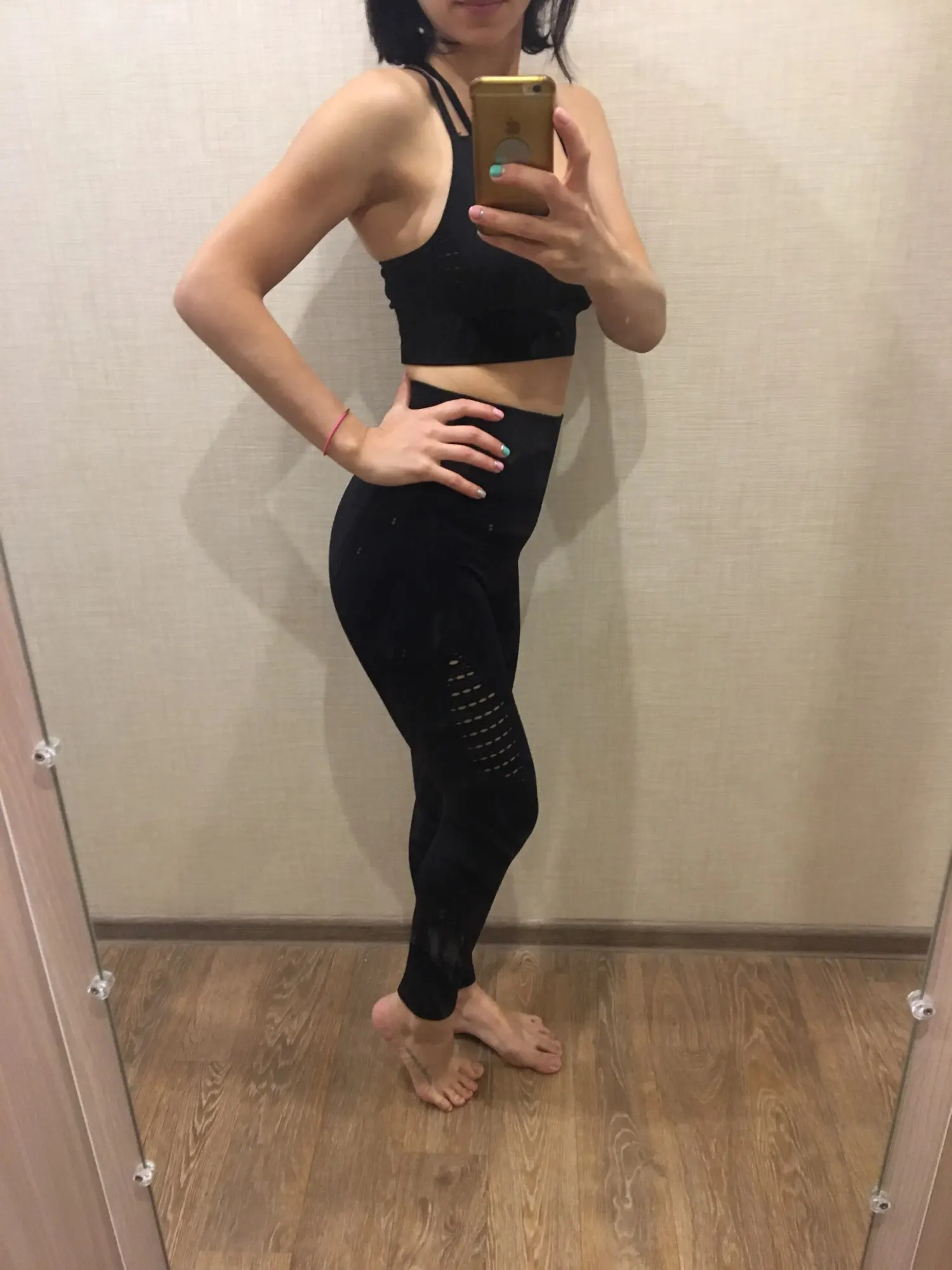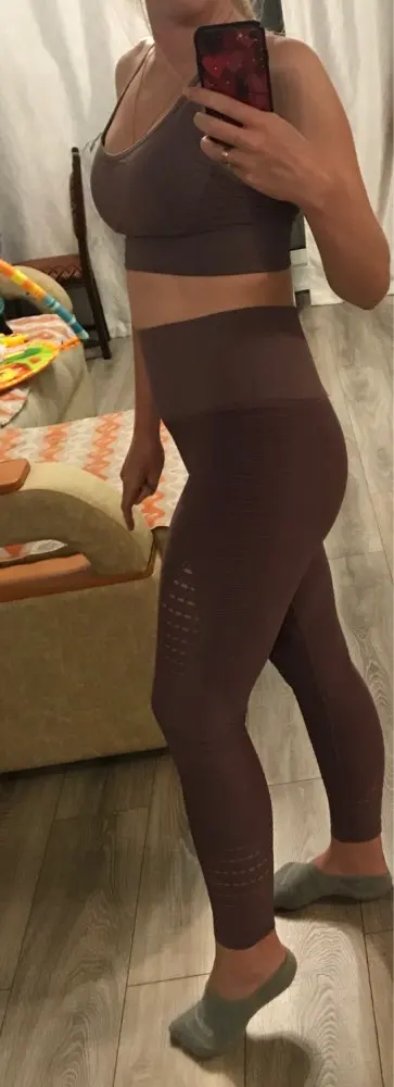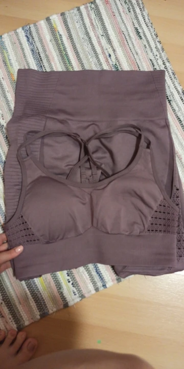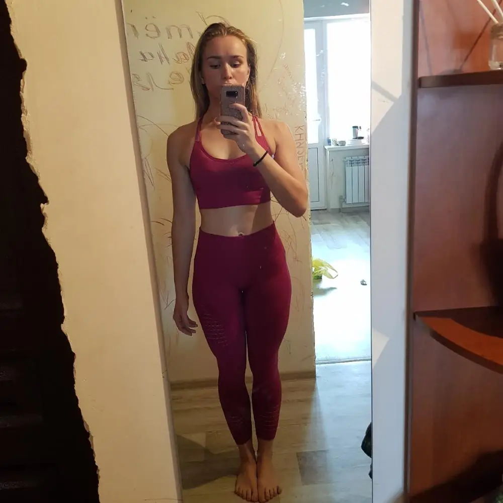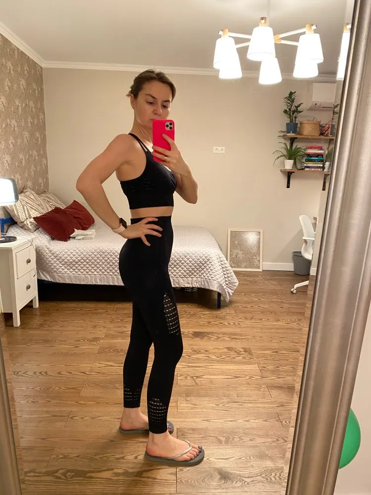 Честно говоря, не ожидала такого качества. Ткань очень плотная, хорошо утягивает, ничего не просвечивает. Брала размер М на рост 160, об95 от65. Село как надо, в талии не свободно, как бывало с некоторыми другими штанами для йоги. Майка тоже понравилась. Единственное - сбоку из перфорации немного видны чашечки. Но для меня это некритично.
