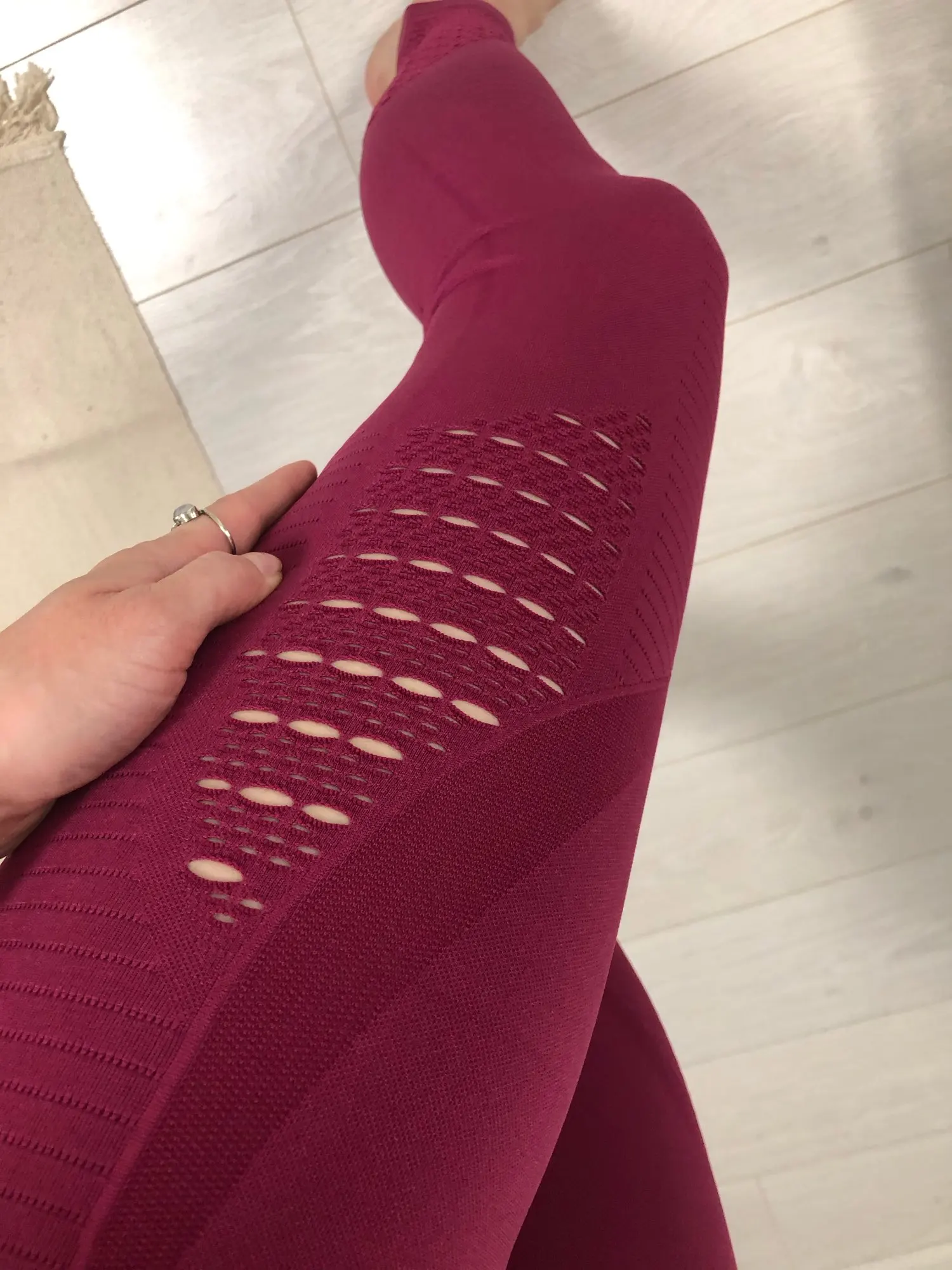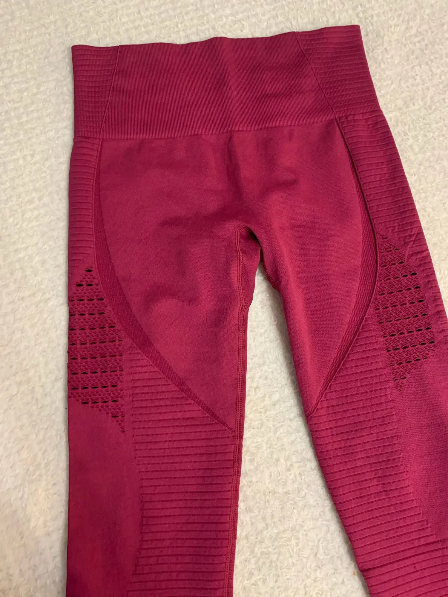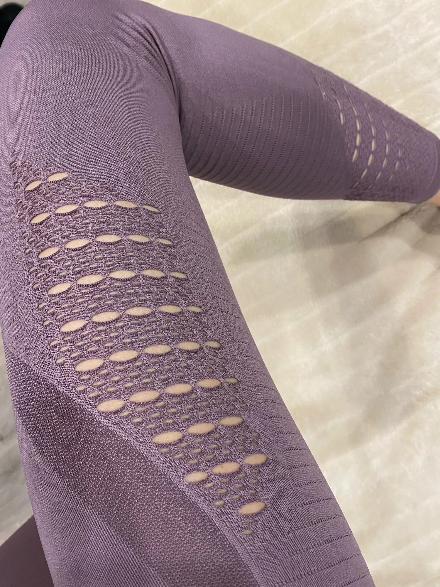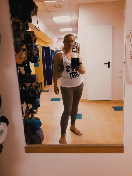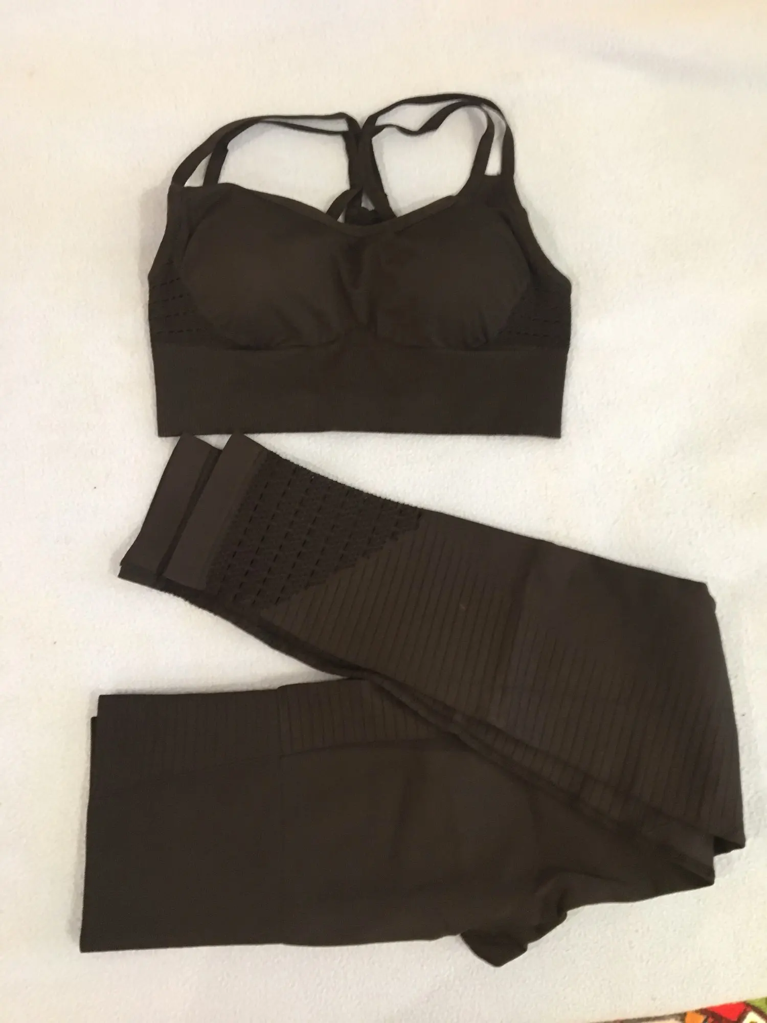 Честно говоря, не ожидала такого качества. Ткань очень плотная, хорошо утягивает, ничего не просвечивает. Брала размер М на рост 160, об95 от65. Село как надо, в талии не свободно, как бывало с некоторыми другими штанами для йоги. Майка тоже понравилась. Единственное - сбоку из перфорации немного видны чашечки. Но для меня это некритично.