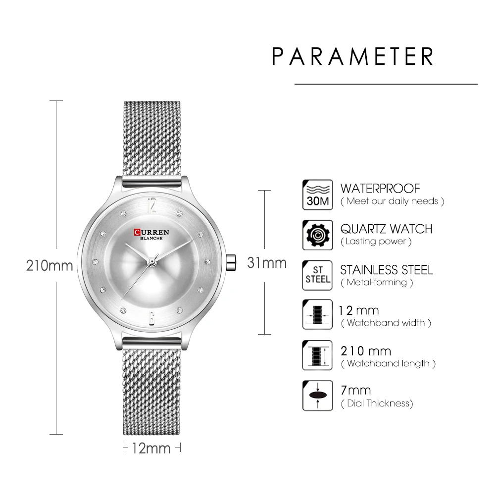 CURREN изысканные простые женские часы, серебристые аналоговые кварцевые часы из нержавеющей стали, женские роскошные часы от ведущего бренда, Relogio Feminino