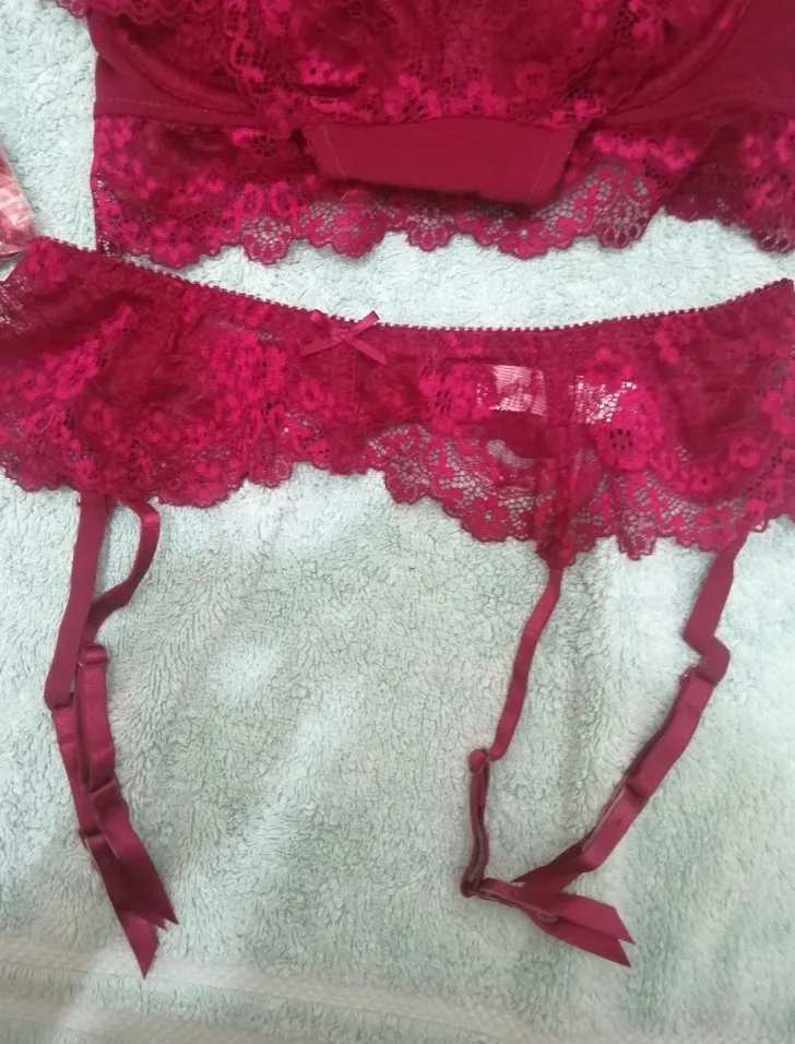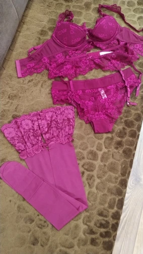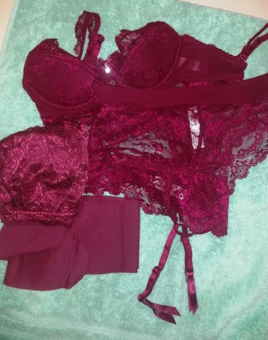 ну что....сам по себе комплект просто огонь. цвет соответствует фото, он кроваво бордовый, насыщенный, материал мягкий, приятный. пояс держит. не сползает вслед за чулками, чулки от комплекта красивые но по качеству не очень. бюзгалтер. что можно сказать о нем. он предназначен соблазнять, одела >соблазнила>сняла...на размер 80D нет глубины чашечки. или он предназначен на другую форму груди. которая по форме больше напоминает тарелочку, но ни как не "немного" обвисшую после 3 детей...в процессе носки грудь вываливается сверху. наклоняться категорически нельзя. все вывалится. НО....мужика соблазнит однозначно, поэтому одевать буду. и скорее всего закажу в чёрном цвете.