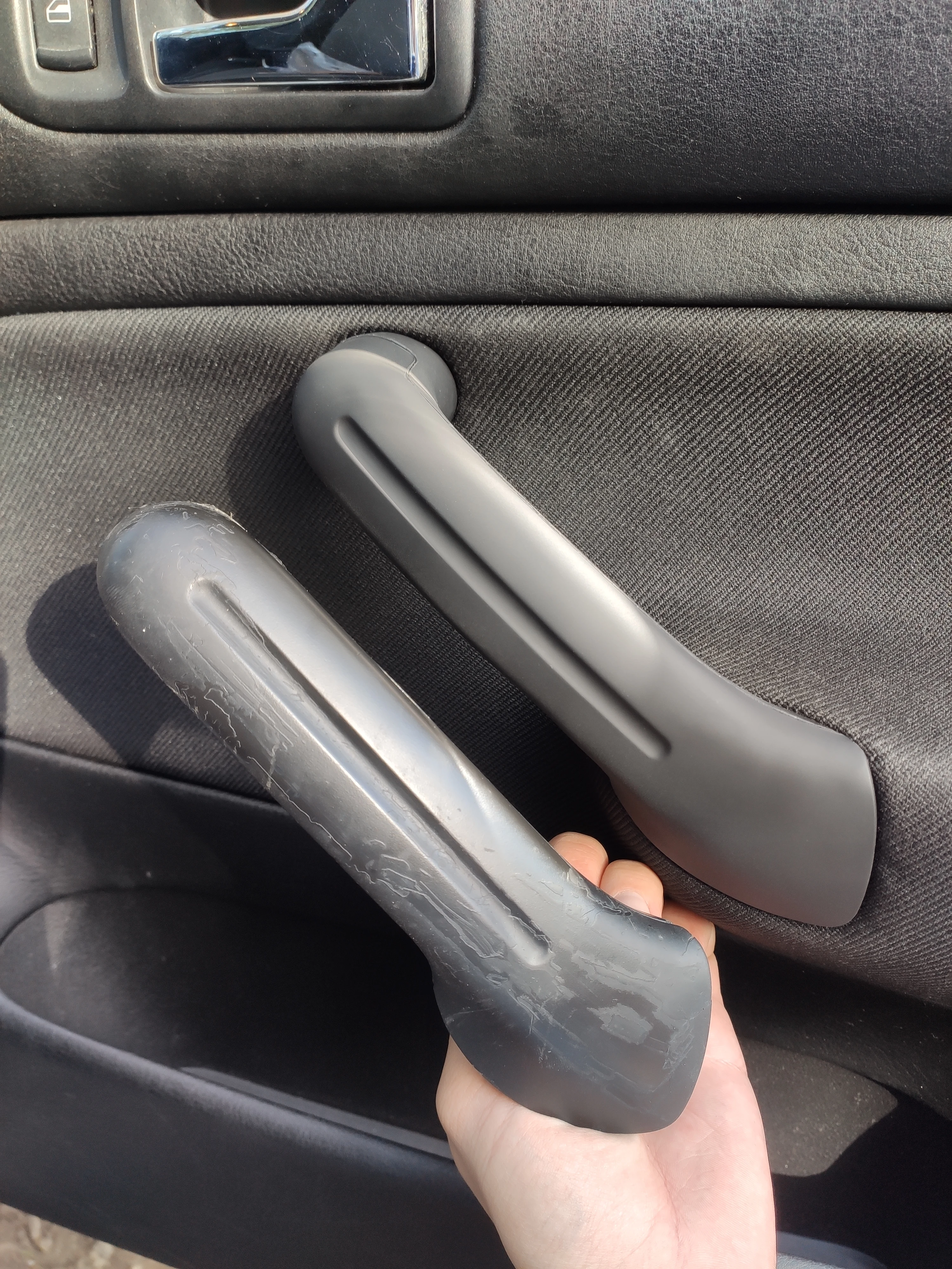 Ручки как ручки, красивые приятные на ощупь, мощные, с хорошего пластика. Как в оригинале с завода в гольфе 4. Только есть маленькие щели на соединении двух половинок у всех пассажирских дверных ручек. Оригинальные ручки вообще не имеют щелей. Но новые красивее чем старые, поэтому не придираюсь
