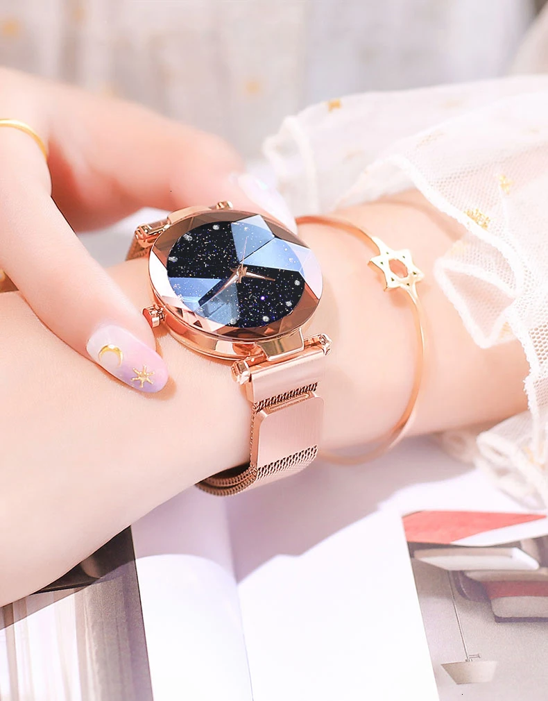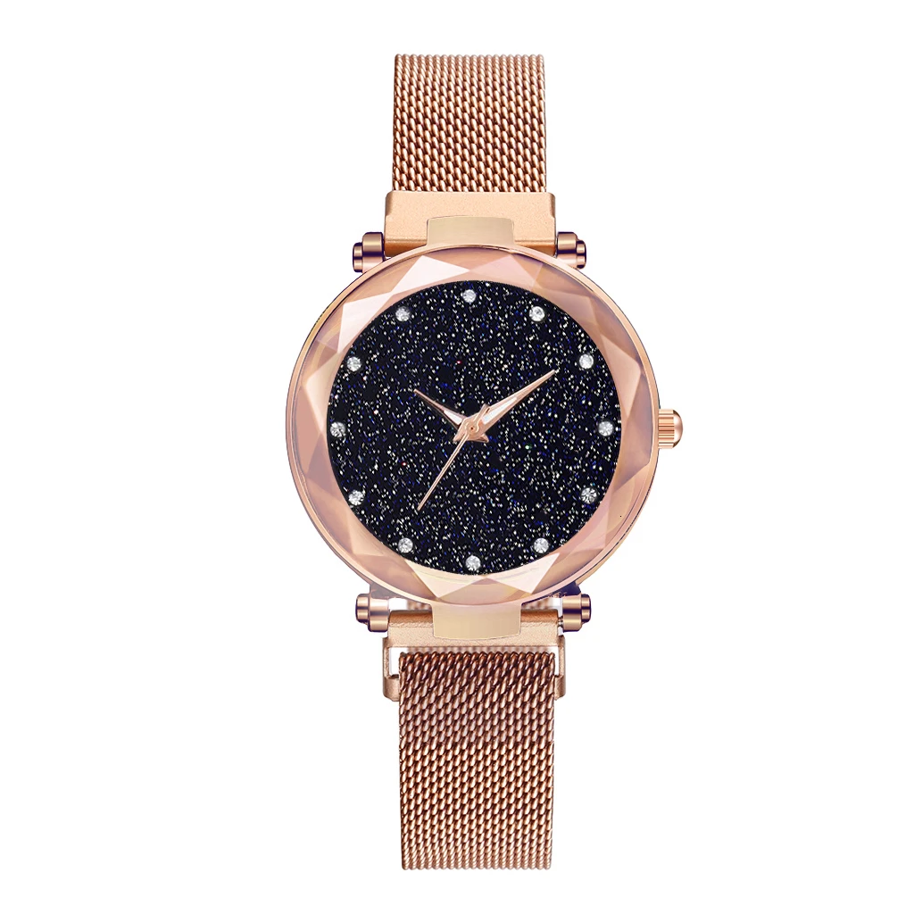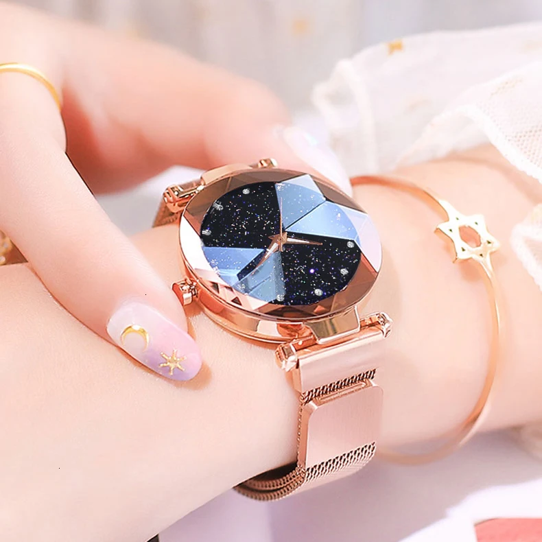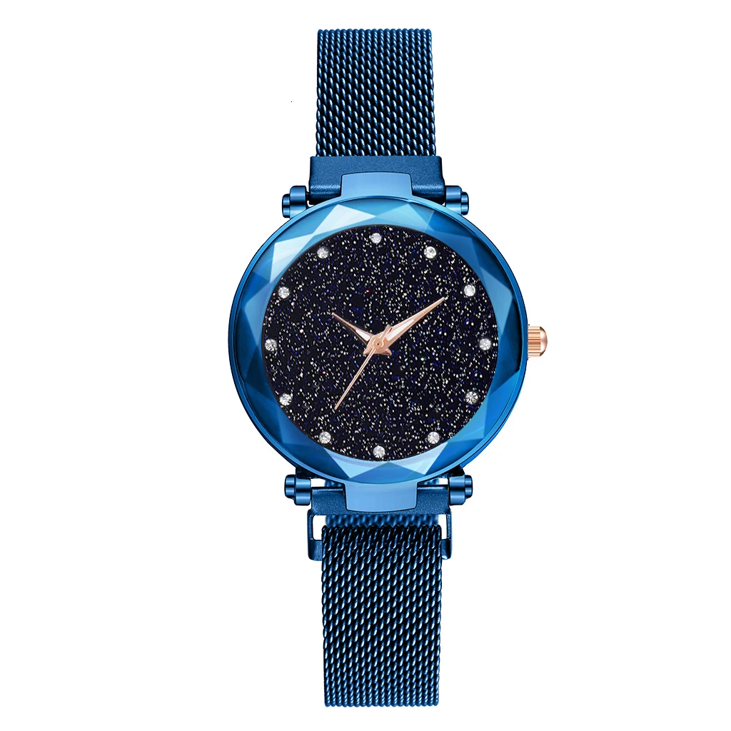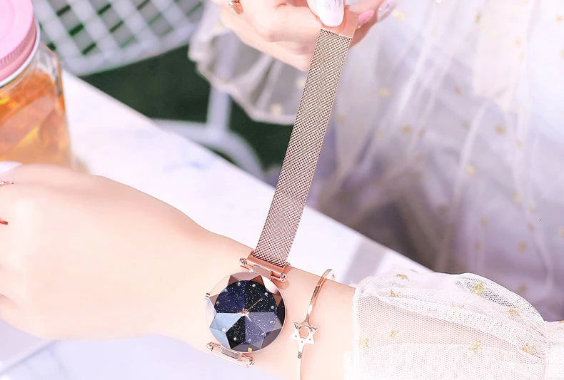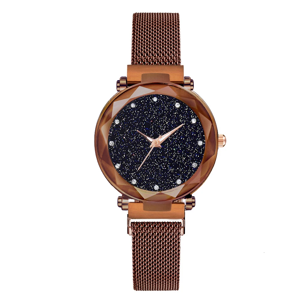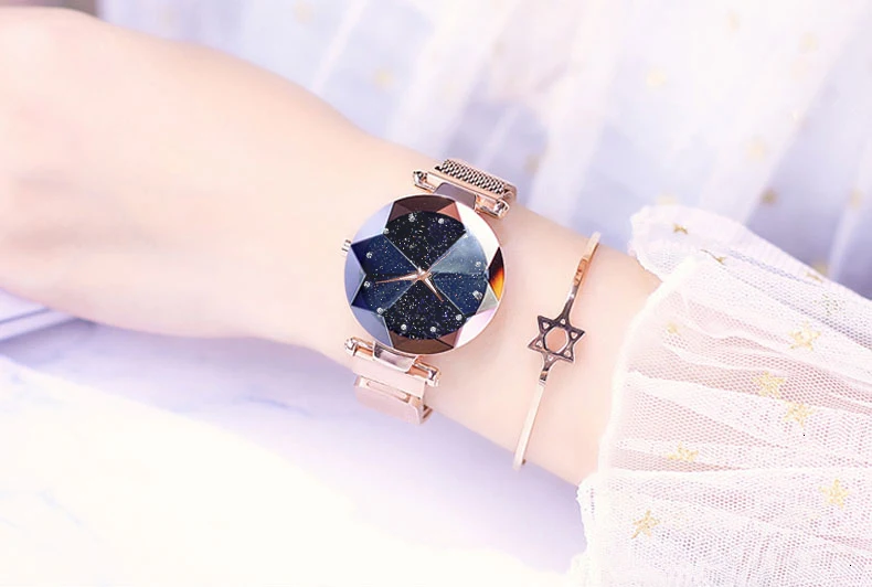 Женские сетчатые часы с магнитной пряжкой, звездное небо, повседневная Роскошная Геометрическая поверхность, кварцевые часы, Лидер продаж