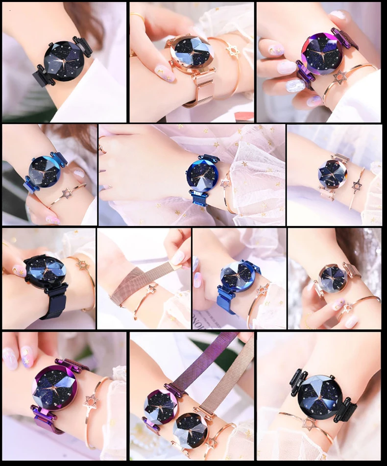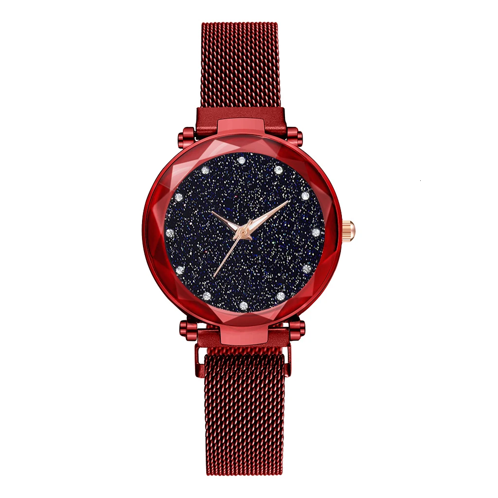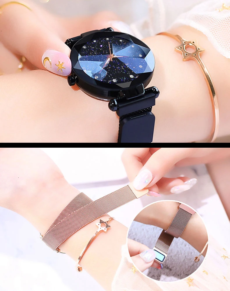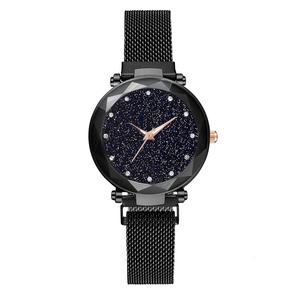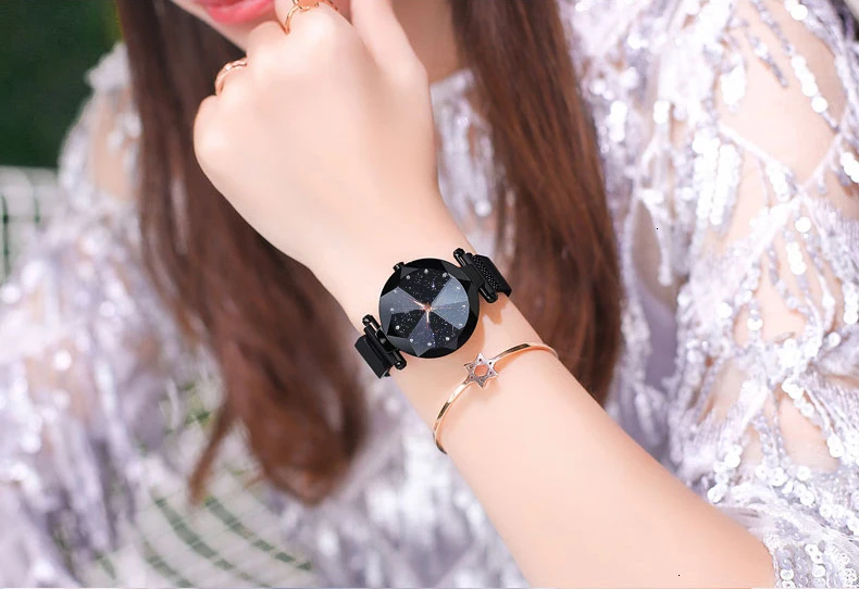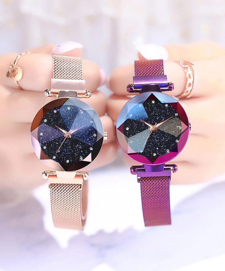 Женские сетчатые часы с магнитной пряжкой, звездное небо, повседневная Роскошная Геометрическая поверхность, кварцевые часы, Лидер продаж