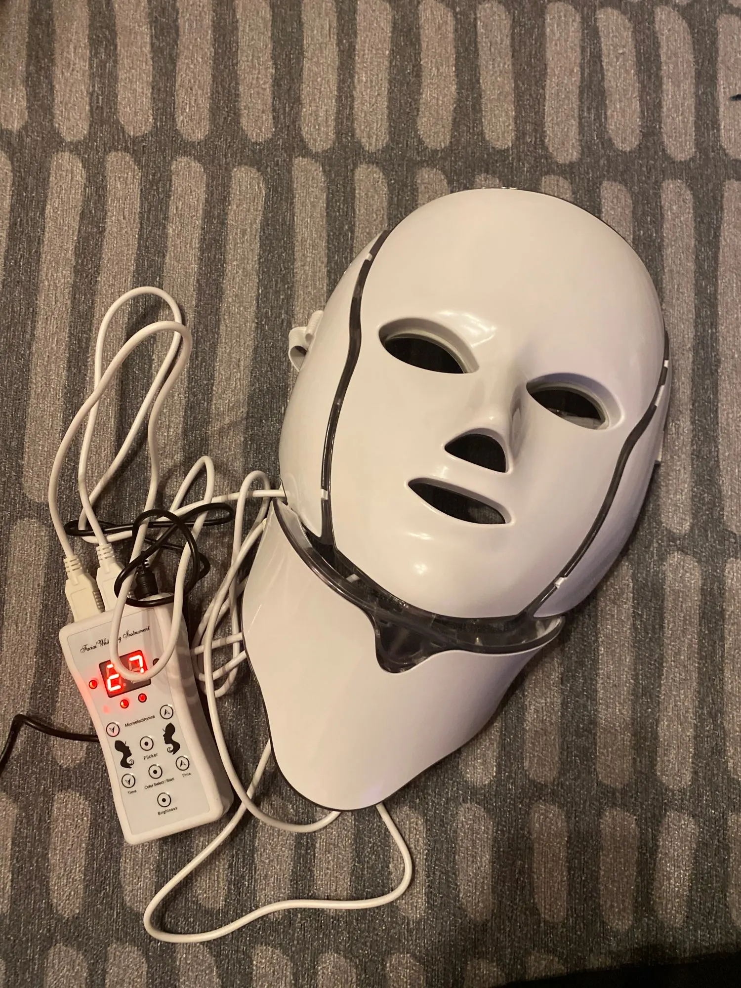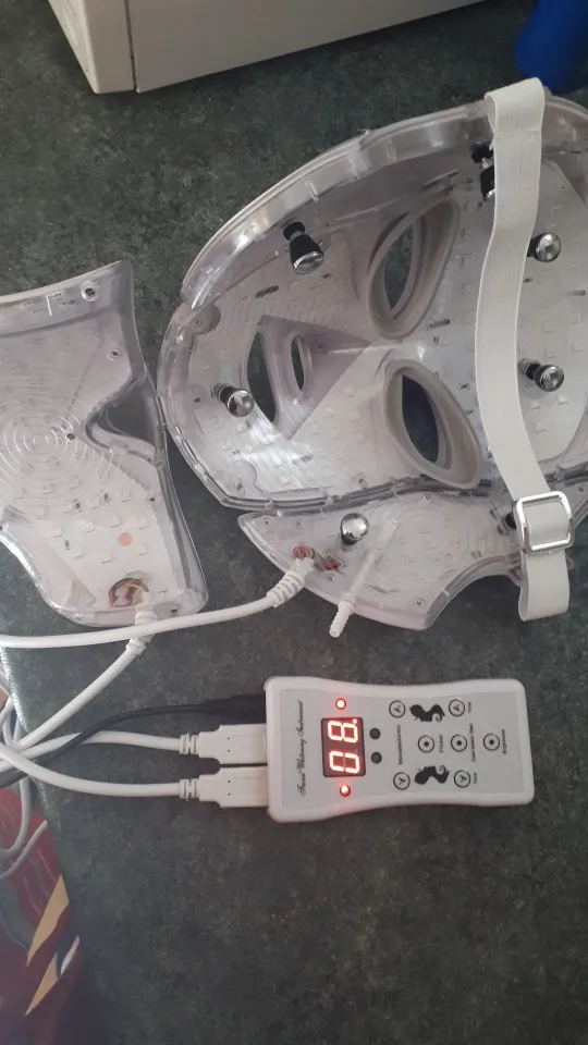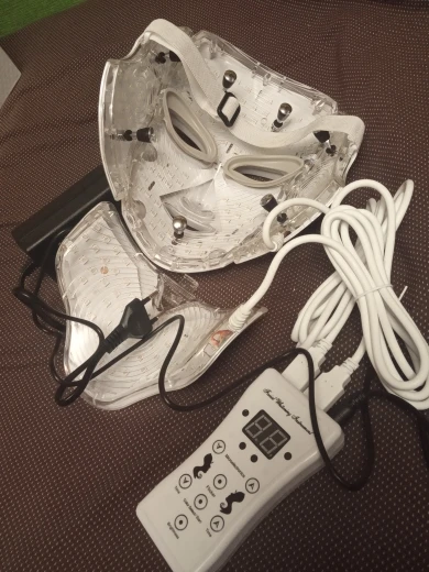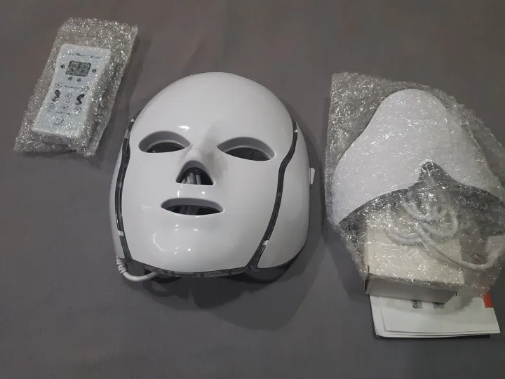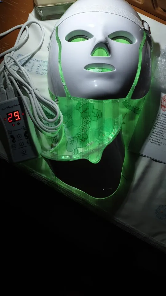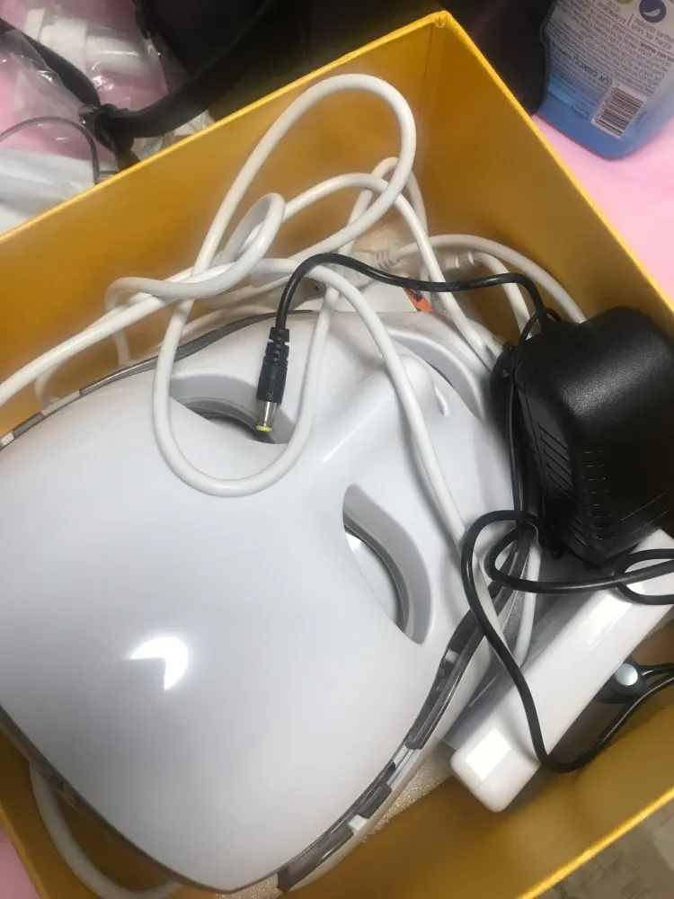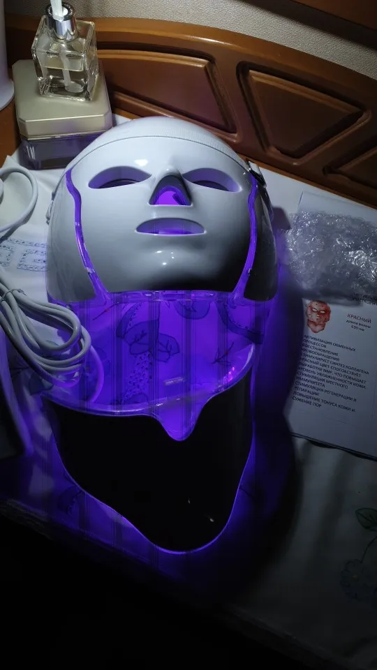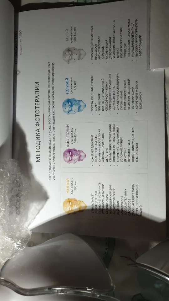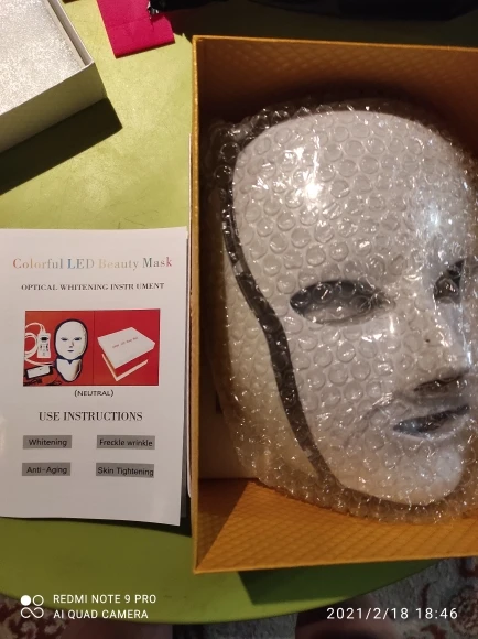 Маска очень тщательно упакована. Работает на чехле без zazhutu. Есть таймер, который может гореть в течение 5, 15,30 мин и т. Д. И после этого времени pika. Руководство на английском языке. Как на данный момент, у вас светло-голубой цвет и несколько прыщей. Рекомендуется. Доставка курьерской почтой pomskiej 2 недели. Коробка супер. Эффект пространства не рекомендую кому-либо витачу в соединенной маске, потому что posrajjhaha