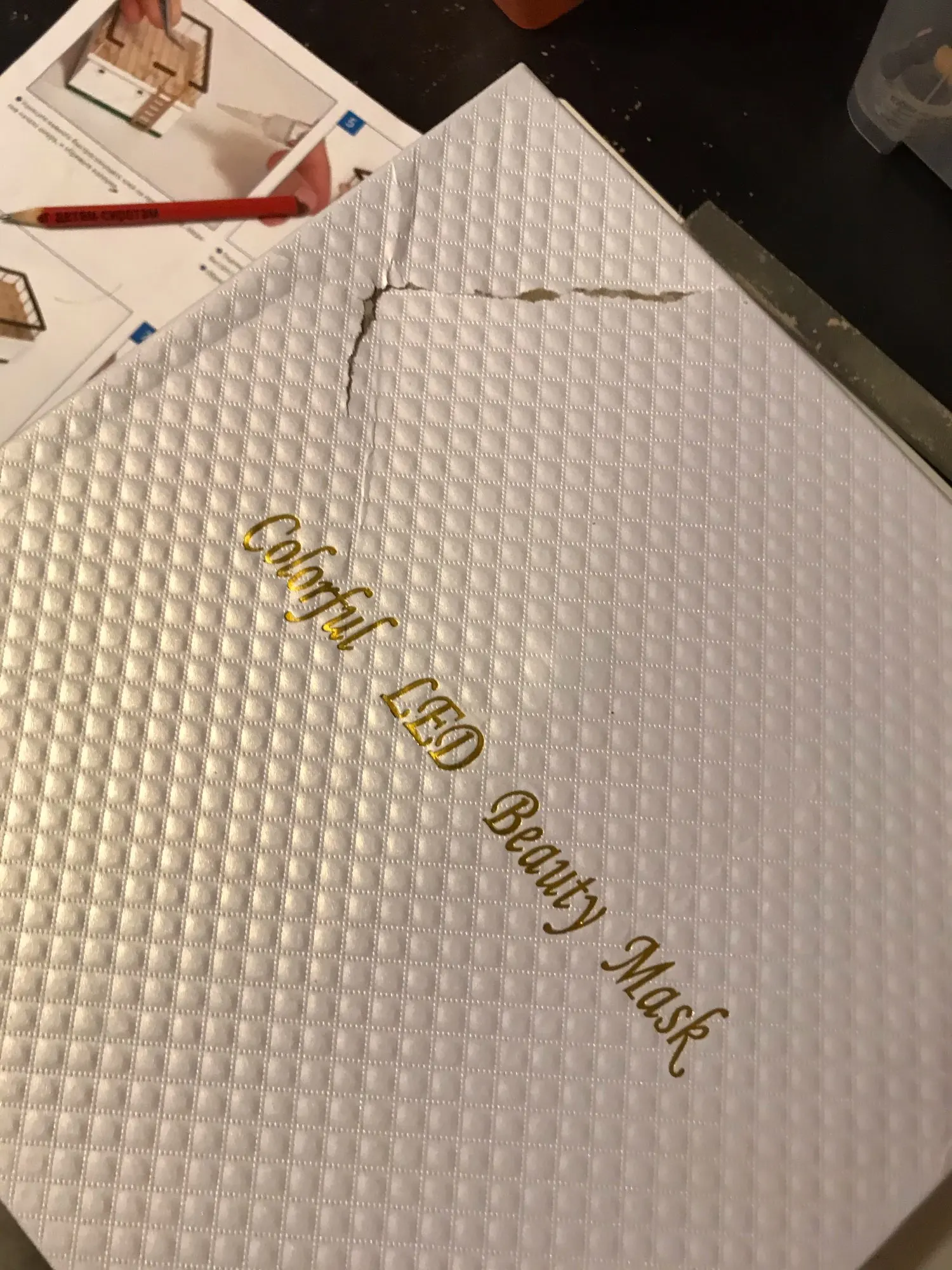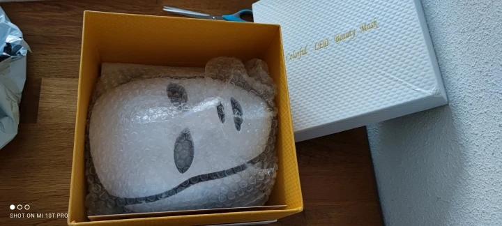Посылку доставили курьером на 8 день, для Сибири это очень хорошо. Покупала на подарок, коробка презентабельная, углы чуть побиты, но не критично. В маске нет желтого цвета, есть два зелёных. Микротоки чувствуются. Маска по весу тяжеловата, функцию свою выполняет.