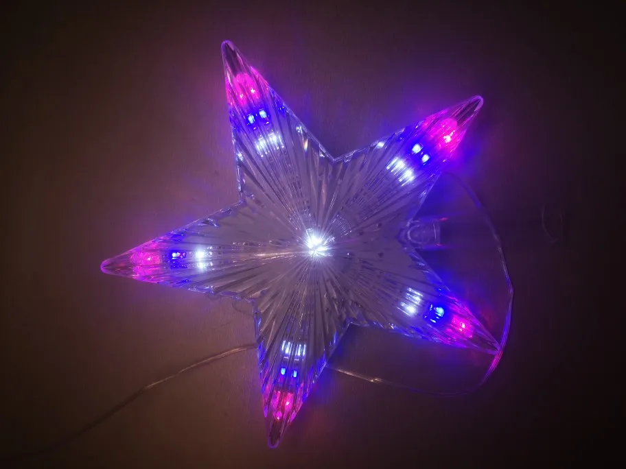 Купил белую звезду, горит красиво и очень ярко, смотреть прямо не неё немного больно глазам, провод очень короткий, сантиметров 50, крепление на макушку и сама звезда достаточно хрупкая, упаковка плохая: простая коробка из тонкого картона, для почты России это может быть смертельно... ко мне пришла с мятой коробкой но целая. Если продавец читает: придумайте более надёжную упаковку. Но горит красиво, настоящая Вефлиемская звезда!