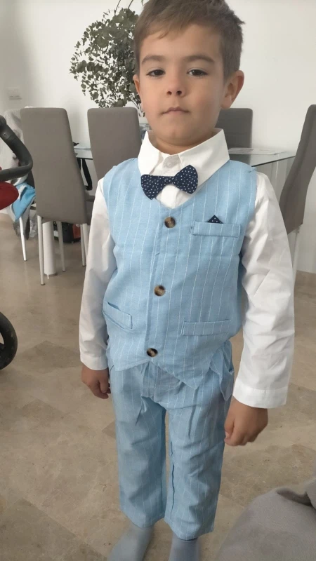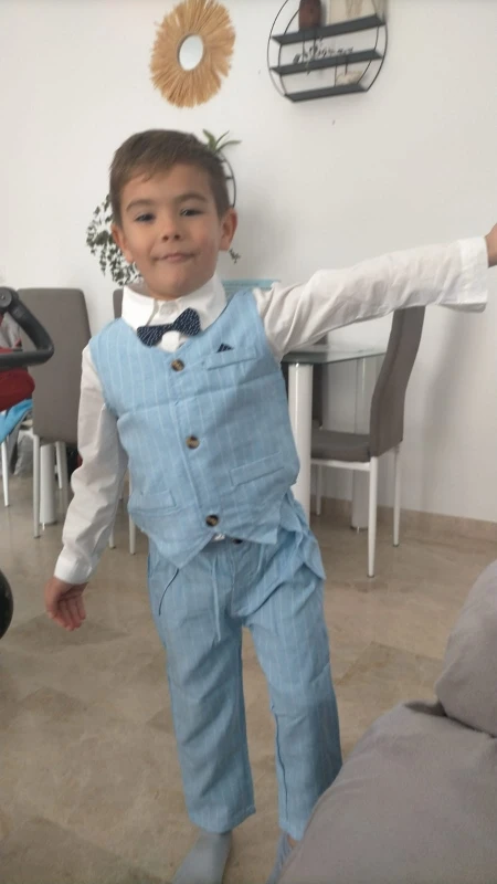 El tejido es como de lino y es perfecto para el verano por ser finito. El traje de la talla 5 años viene bien de talla mi hijo se pone normalmente la talla de chandal 5-6 años y le ha quedado estupendo. La que he comprado de 9 meses es grandecillo, no sé lo he probado aun pero ya pondré otra reseña