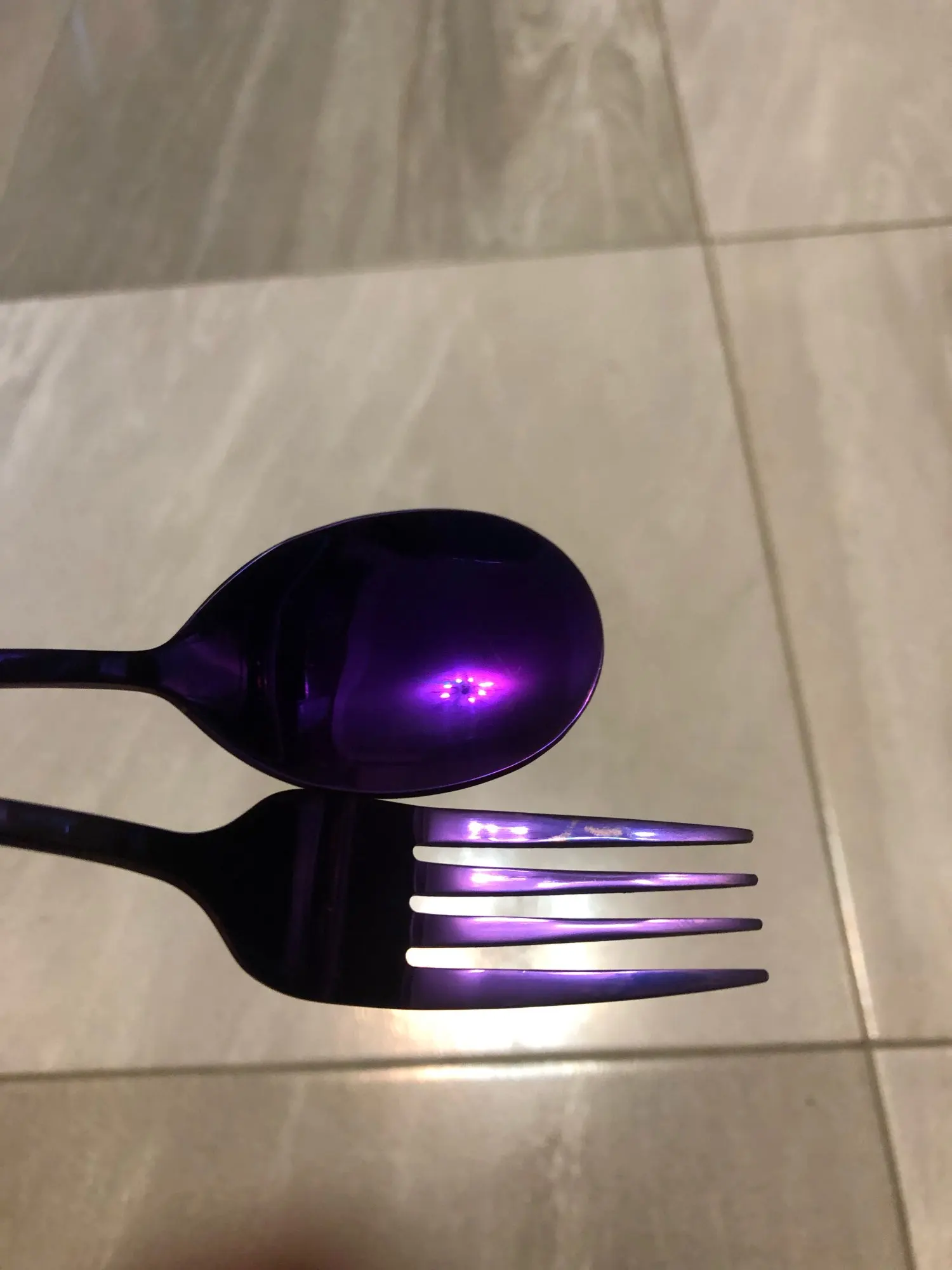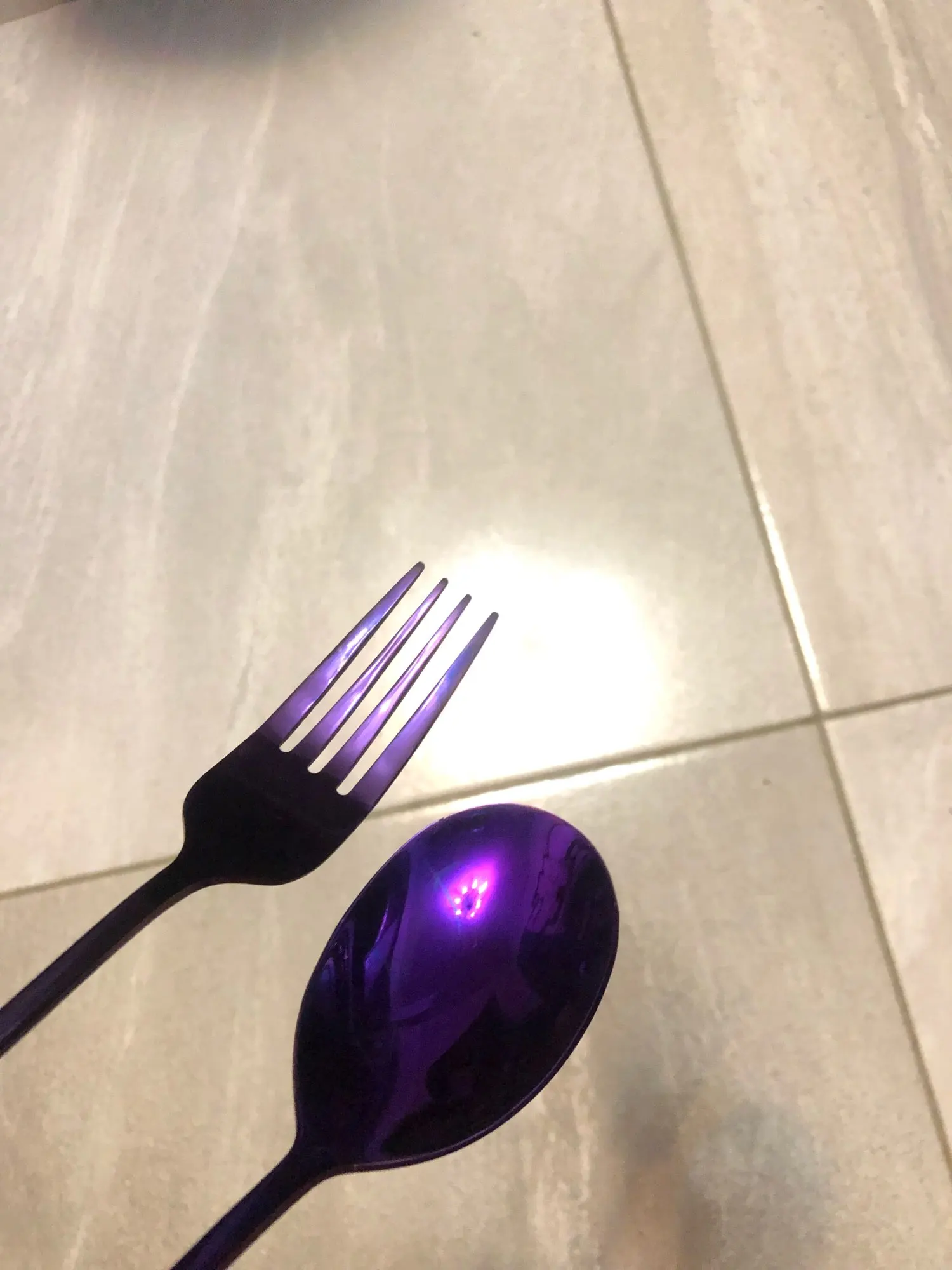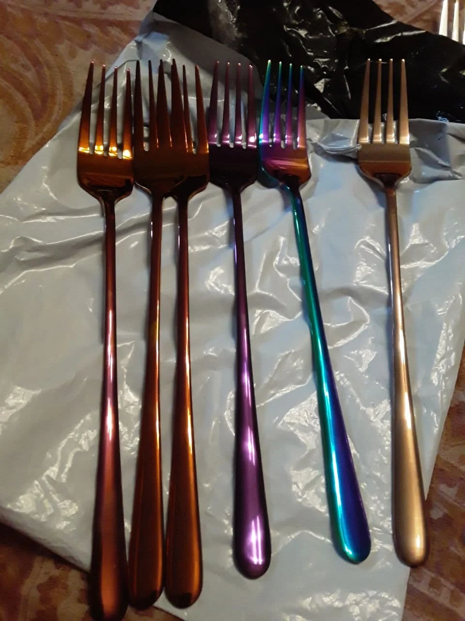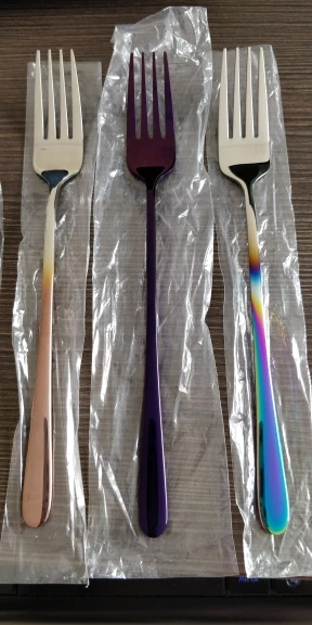Заказывала несколько вилок разного цвета. От rainbow NO.3 ожидала глубокого красного цвета с переливами в оранжевый и фиолетовый, на деле цвет скорее медный с легким фиолетовым отливом, который быстро испаряется, стоит взять вилку в руки. Поэтому в этом цвете немного разочарована. Сама вилка легкая, но прочная. Глянцевая, блестит, с легкими дефектами нанесения цвета, но не поцарапанная. Упакованы вилки были очень хорошо, пришли в общей посылке с товарами из других магазинов.