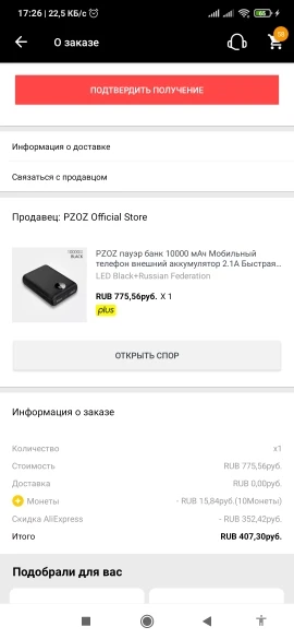 Продавец - честнейший человек. Ситуация была следующая. Я заказал один пауэрбанк из Китая, т.к. из России доставки на тот момент не было. Посылка где-то застряла на границе. Срок защиты подошёл концу. Договорились, что продавец вернёт деньги, а я со своей стороны сразу же закажу ещё один, уже из России. Так и сделали. Из России товар пришёл за четыре дня. Деньги тоже вернулись, правда, площадка только через две недели перевела деньги в банк. А спустя немного времени и потерявшийся заказ нашёлся и приехал. Сам товар отличный, качественный. Айфон три раза заряжает. Однозначно рекомендую, как товар, так и продавца. Пусть Господь его благословит.
