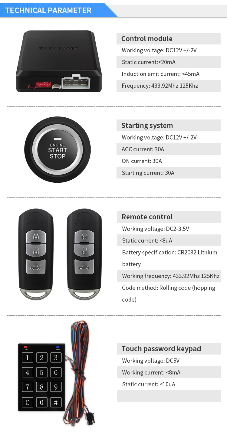 Система пассивного бесключевого доступа EASYGUARD PKE, дистанционный запуск двигателя, Push Start сенсорный ввод пароля, автоматический запуск