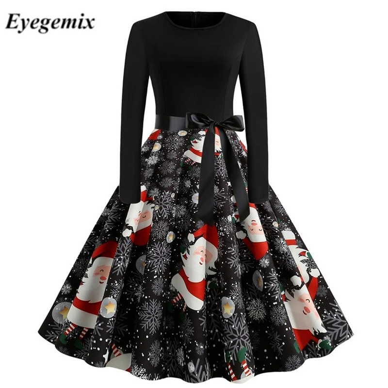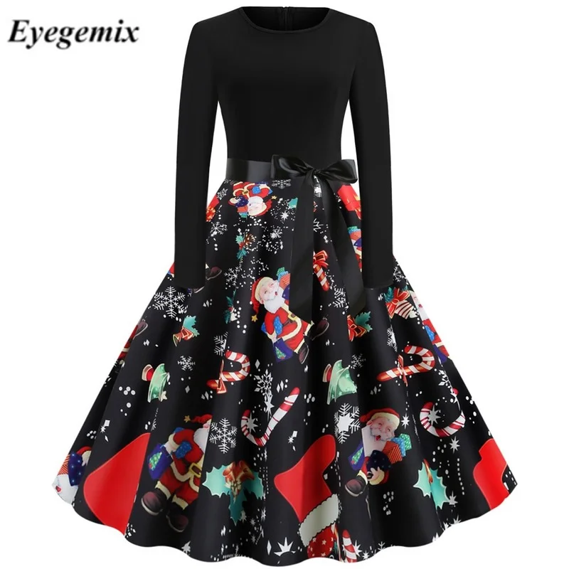 Женское платье с длинным рукавом junxi WAN, черное повседневное облегающее платье с круглым вырезом, с длинными рукавами, с длинным подолом с рождественским принтом, в стиле 1950-х и 60-х, зима 1950