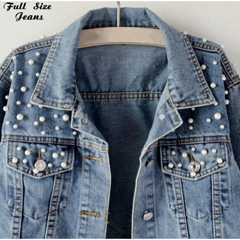 Designer Pearl Beading Black Short Jean Jackets Korean Chi Street Jeans Jacket Chi Cotton Collar Blue White Cropped Denim Coat