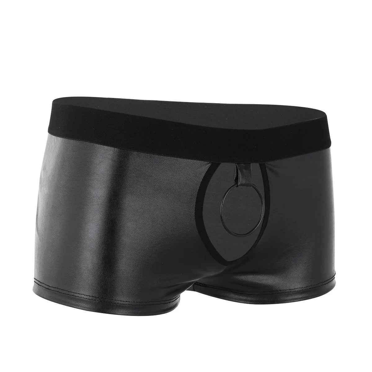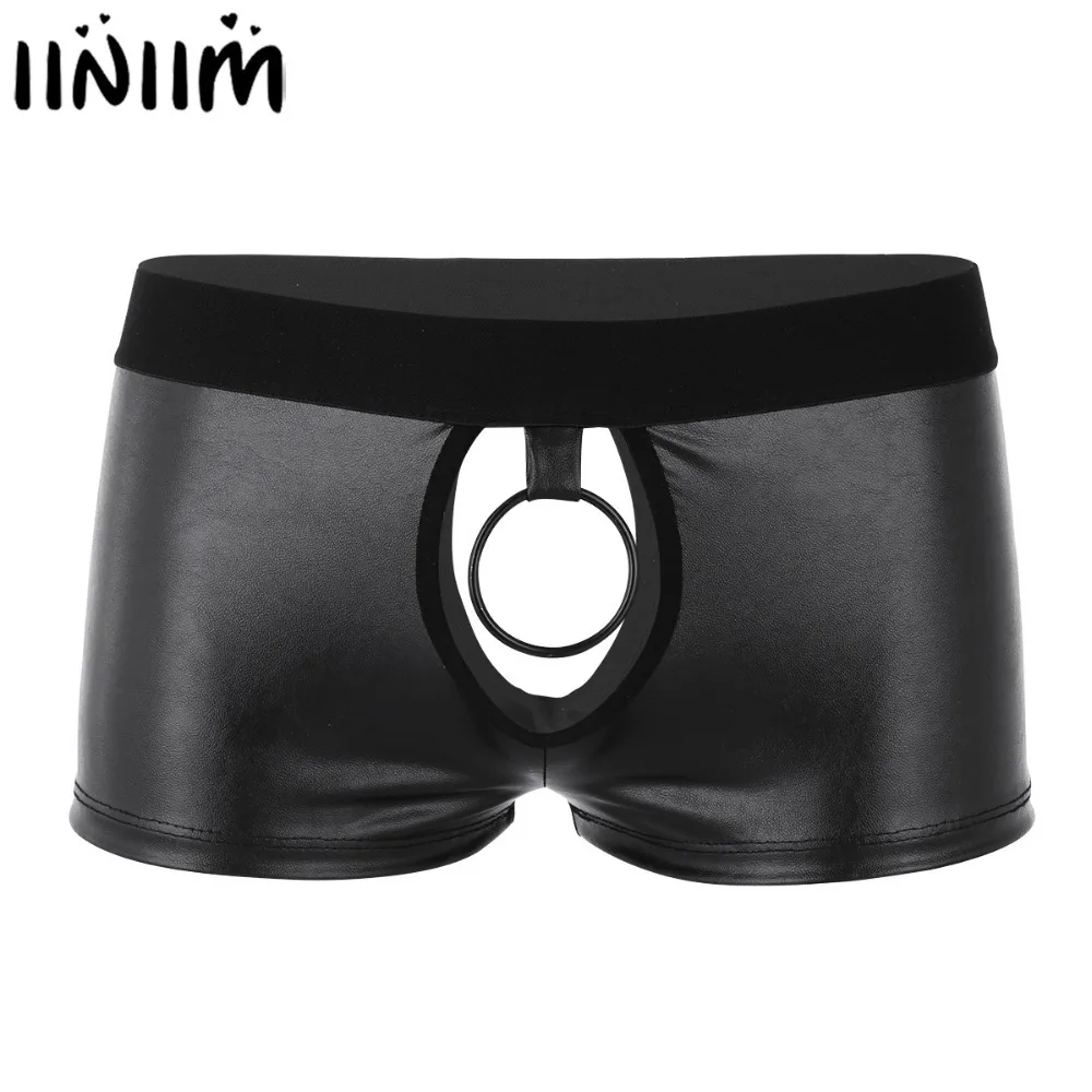 Мужские трусы-боксеры iiniim, мягкие трусы из искусственной кожи с вырезами и открытым пенисом, Сексуальное Нижнее Белье для сна с круглым кольцом