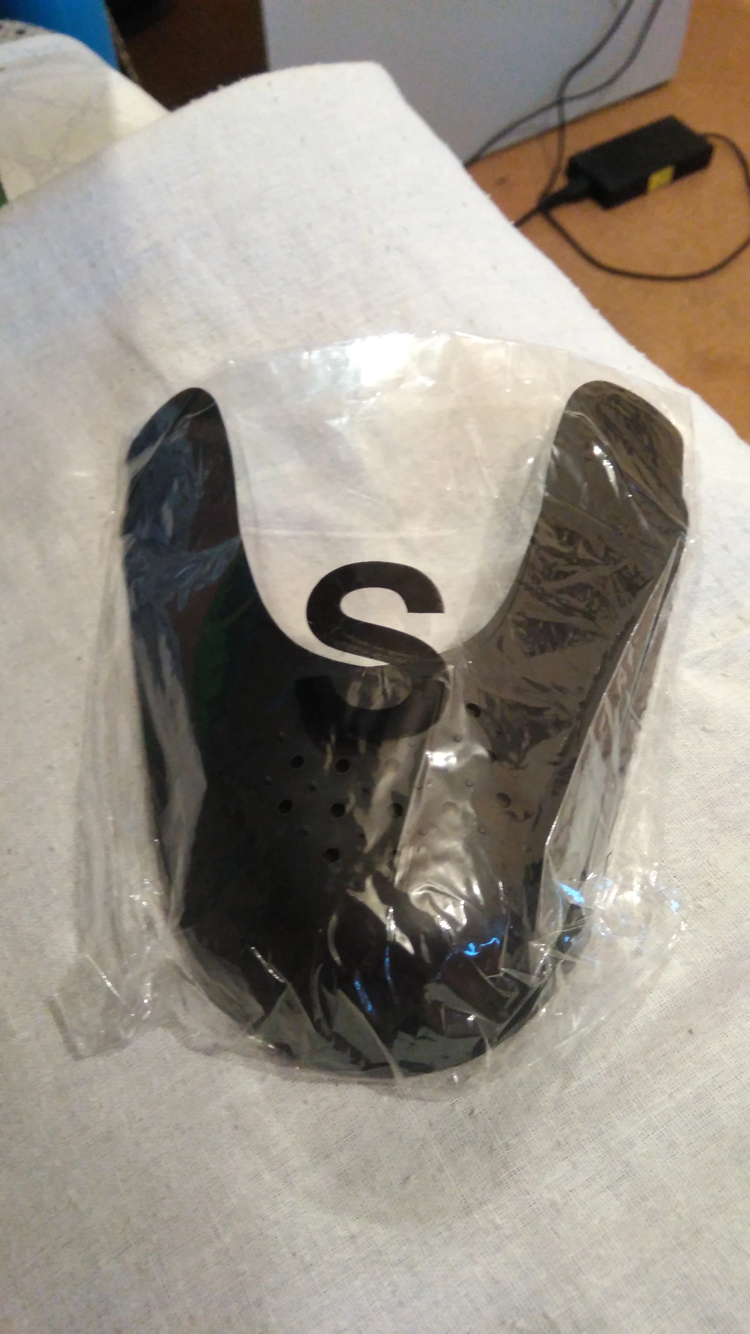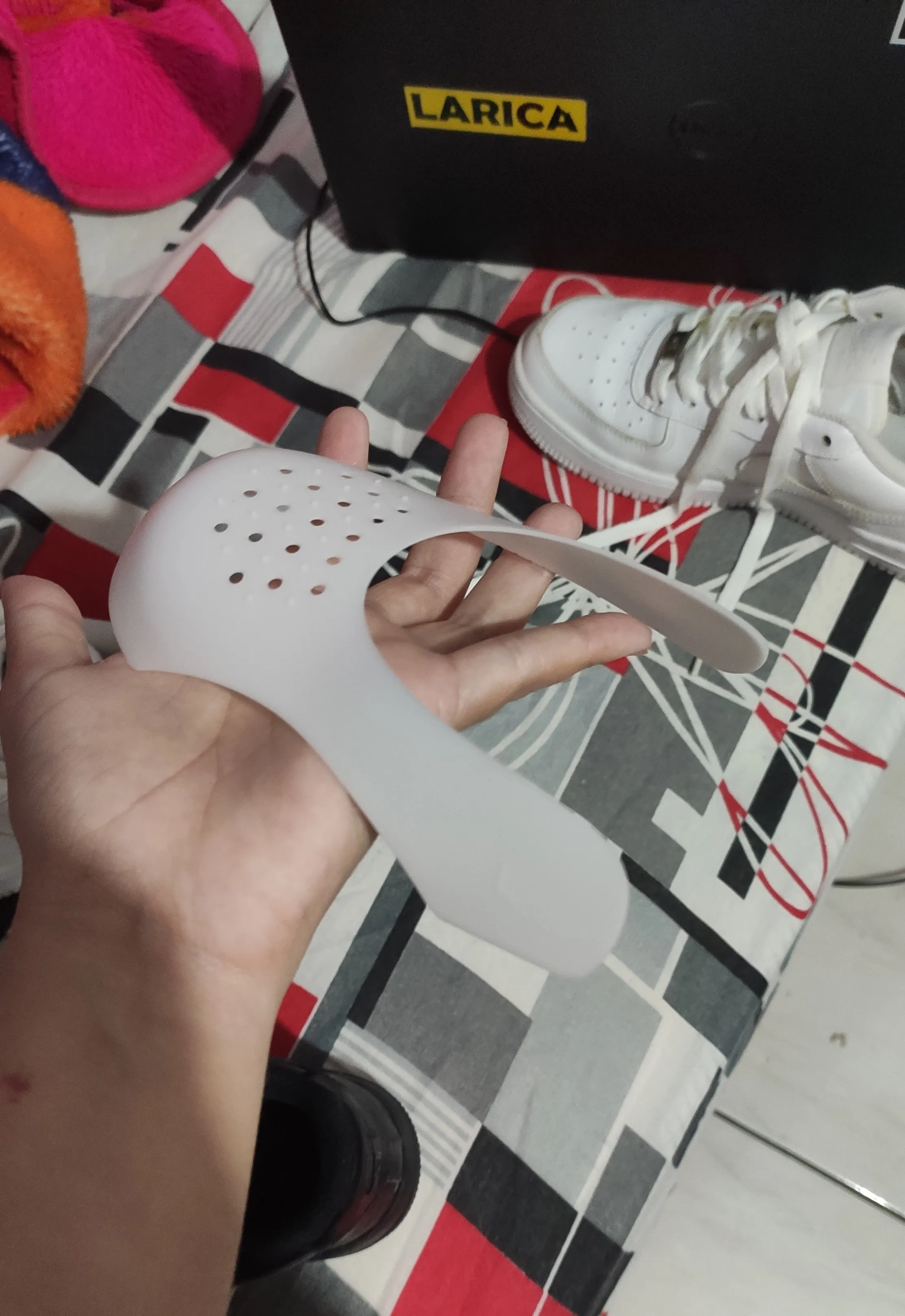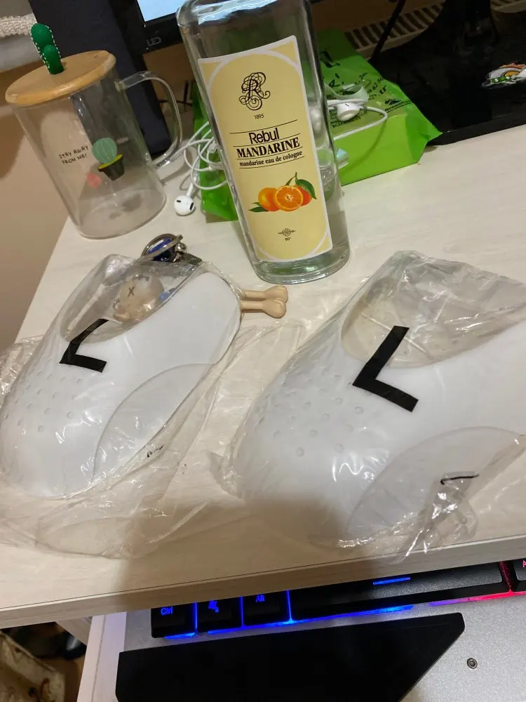 Посылка пришла очень быстро, где-то за неделю. На эир форсы размера 10 ЮС, кажется, лучше брать размер меньше, чем L. В целом штука довольно бесполезная, от заломов точно не спасет и не убережёт :(