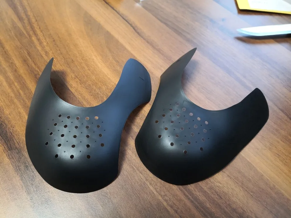 Те кто придумал эти защитки я вас обожаю!!!❤️ Хоть пластик тонкий и достаточно прилично так гнется, на первый взгляд можно подумать, что эффекта не будет. Но когда я попробовала вставить в их форсы, где сильные заломы, они выпрямились (конечно, не прям полностью исчезли, но выглядит это куда опрятнее, чем без защиток). Если вставить в новую пару обуви, то прощайте заломы Всё пришло в отличном состоянии, ничего не погнулось, все супер! У меня 37,5 размер обуви взяла S. Вот как на второй фотке они расположены, так и надо их вставлять (сбоку указана если что где какая - левая/правая). Продавца рекомендую❤️