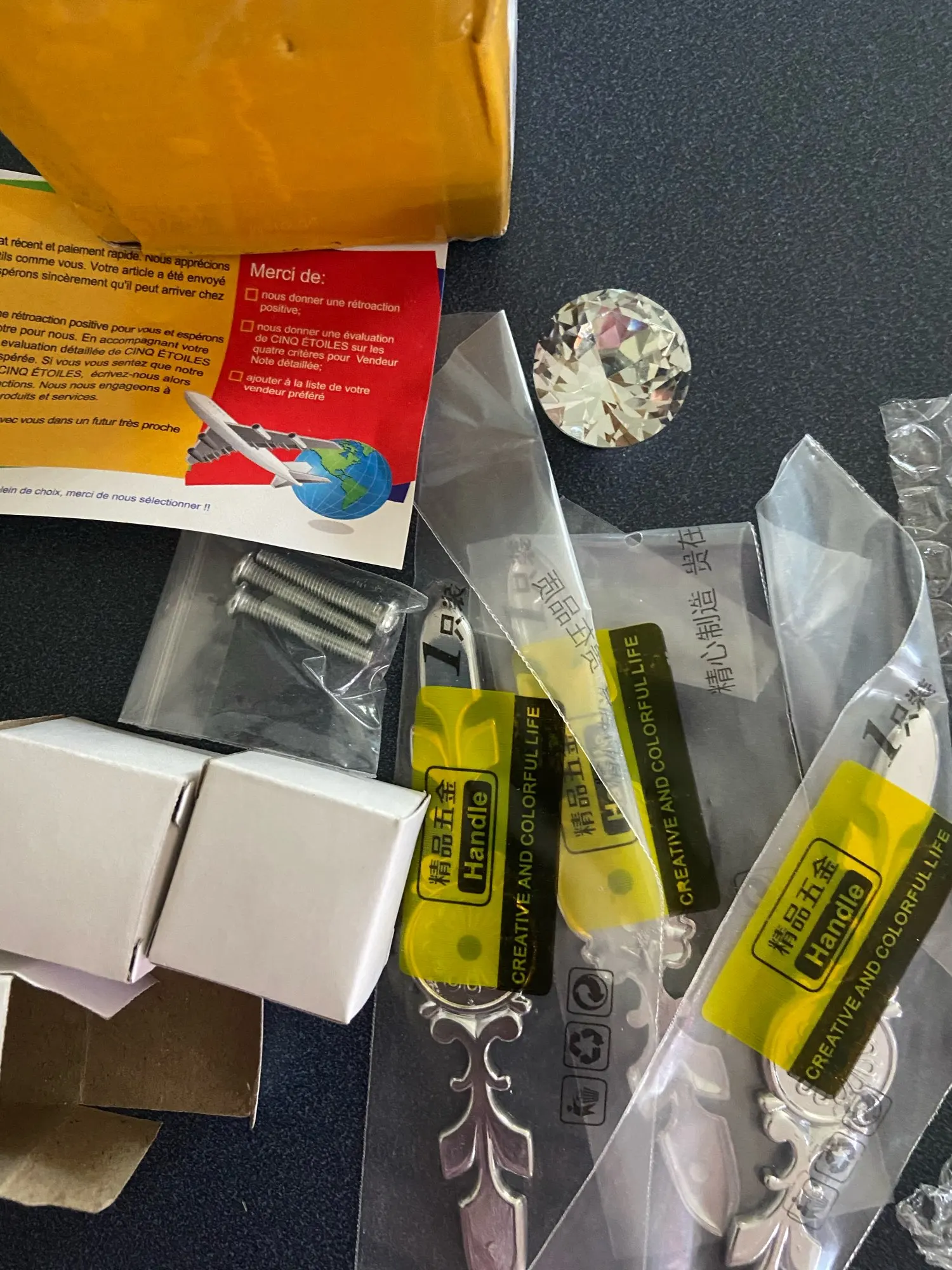Товар в порядке. Проблема только в том, что винты не совместимы (они подходят, но когда я кладу их в ящик, они не завинчиваются до конца, и ручка просто висит)