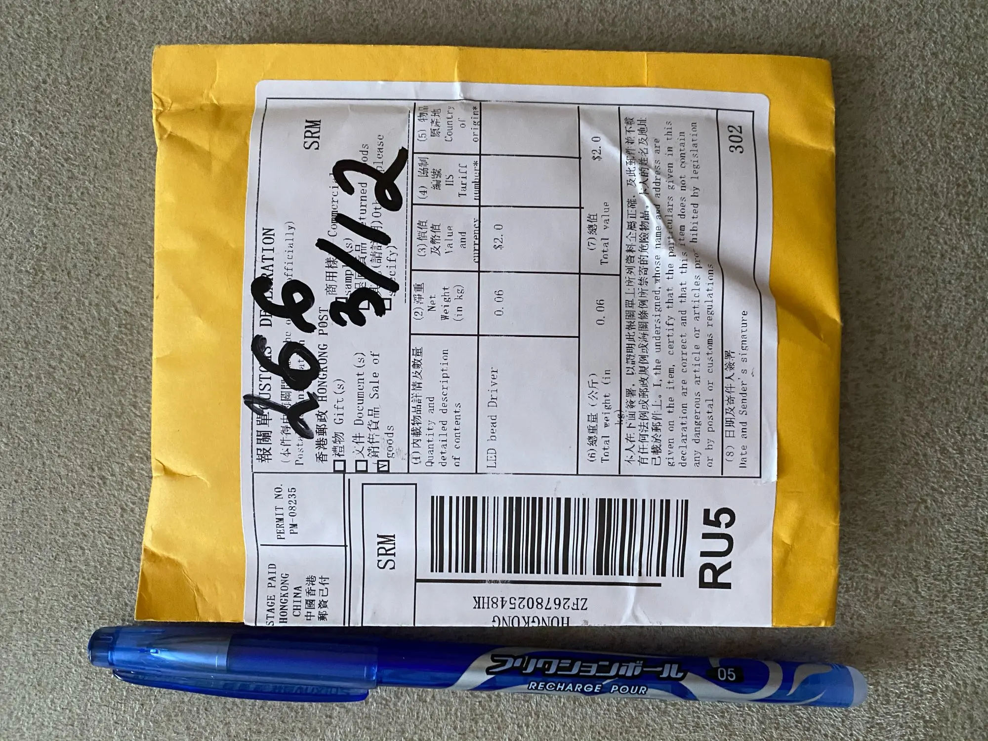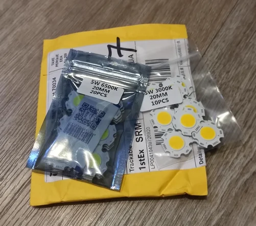 Пришёл полностью отслеживаемый пакет за 15 дней в Ижевск. Проверил все светодиоды под напряжением. Брак не обнаружил. Вот только ток потребления у них оказался всего 100 мА. До этого брал такие же светодиоды, у тех ток был в два раза больше. Даже визуально видно что у новых светодиодов кристалы меньше.