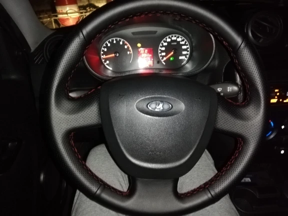 Оплётка, конечно же, не кожаная, но очень приятная на ощупь) подошёл четко, отравили быстро. В день получения сразу же установил,,, попотел, конечно, но это того стоило) в комплекте два клубка ниток, пластиковая лопатка, напёрсток, иголка, двусторонний скотч хороший и инструкция) продавца советую )