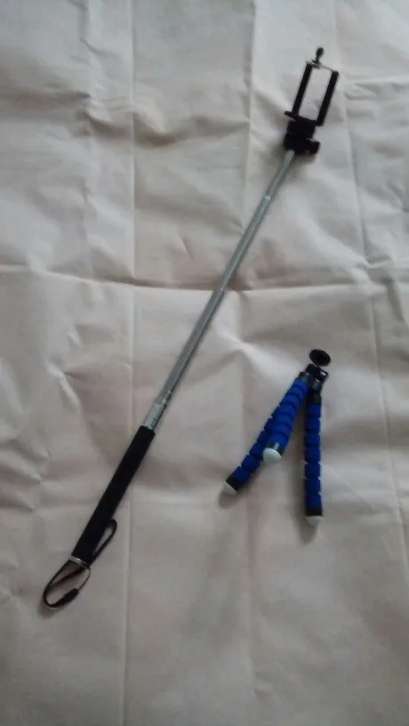 Продавец положил в подарок крошечную треногу-штатив с гибкими ножками для телефона. Тренога сделана так себе - долго не проживет. А вот палка годная, просто на удивление за такую цену. И она реально длинная - около метра. Кто собирается покупать, имейте в виду, на палке нет кнопки управления затвором - чтобы сделать фото, вам понадобится выставить на телефоне задержку срабатывания затвора.