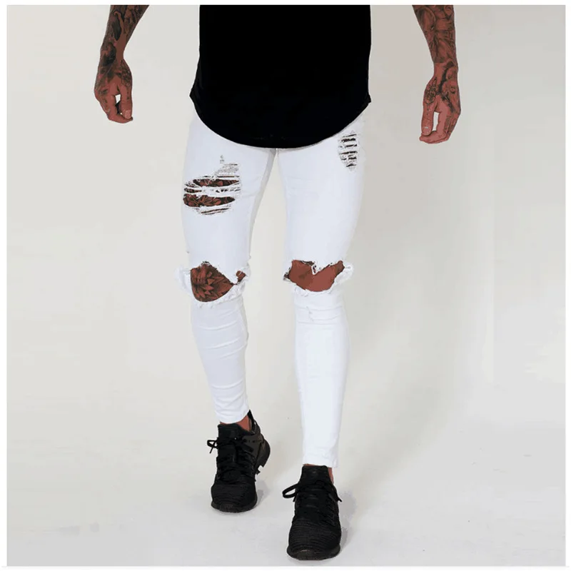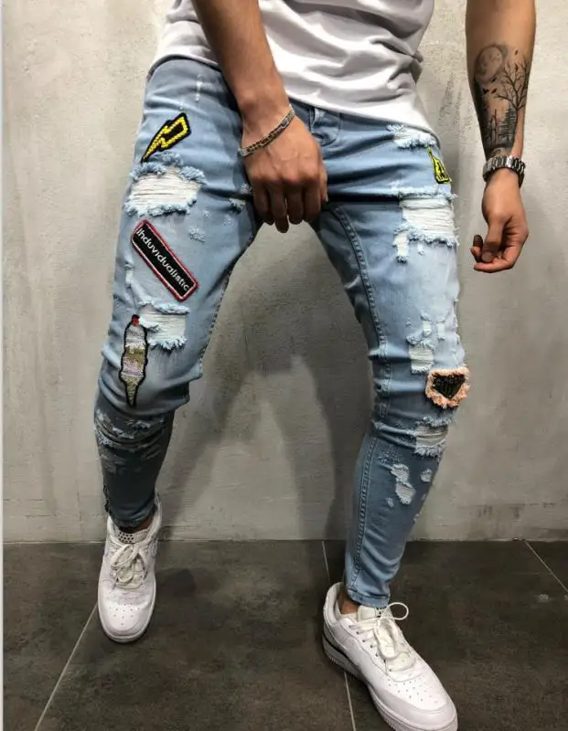 Мужские рваные джинсы-карандаш с вышивкой, облегающие мужские брюки...