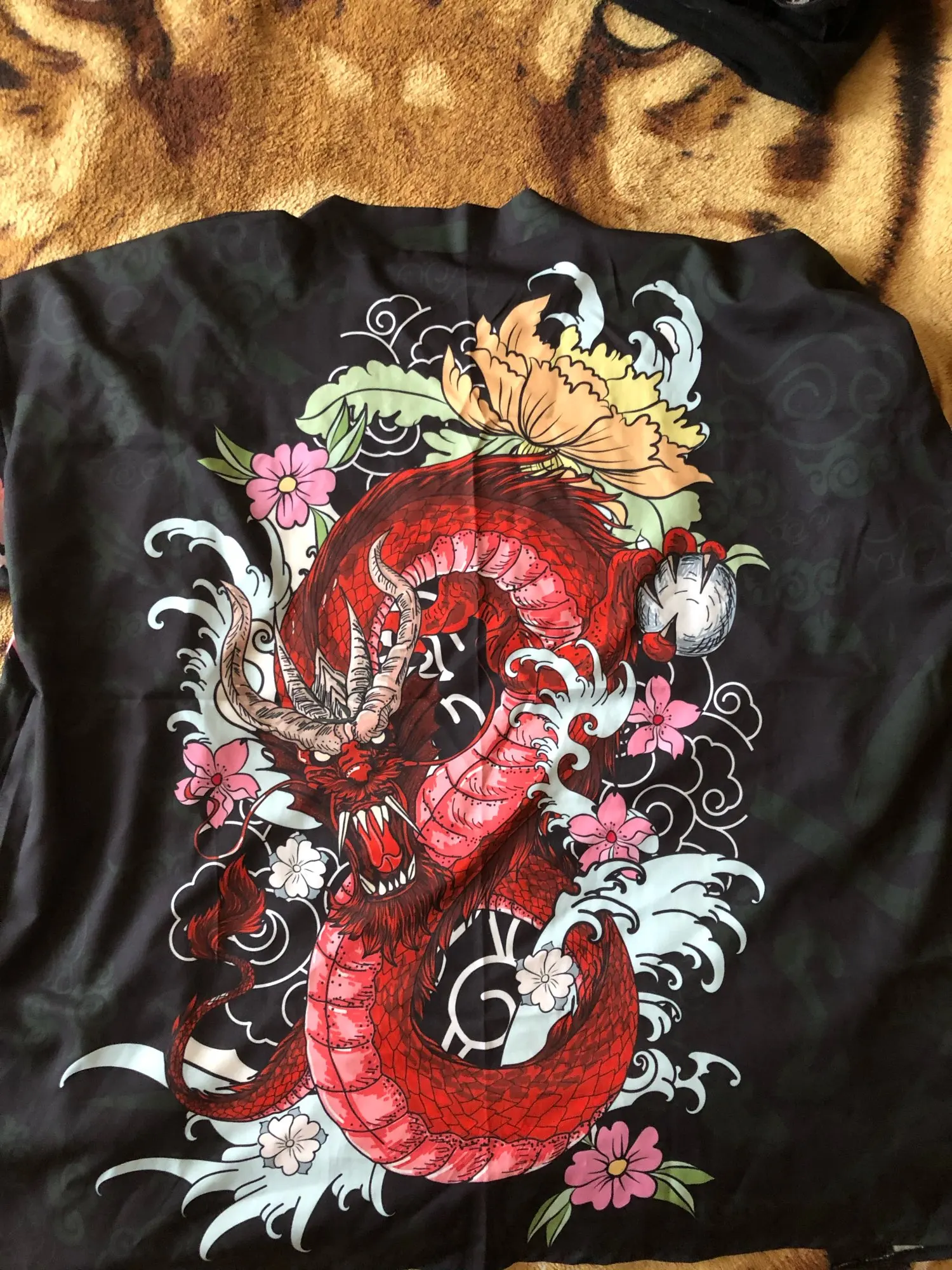 Красивое кимоно, смотрится очень эффектно. Ткань приятная на ощупь, только сильно электризуется. Рисунок четкий и яркий, прошито все качественно и аккуратно. На мой взгляд, не хватает пояса, но за свои деньги очень классная вещь