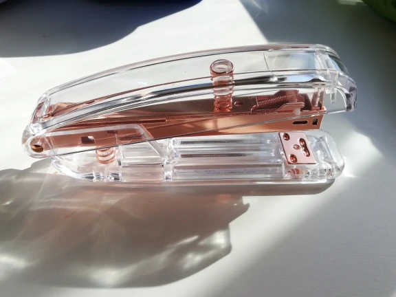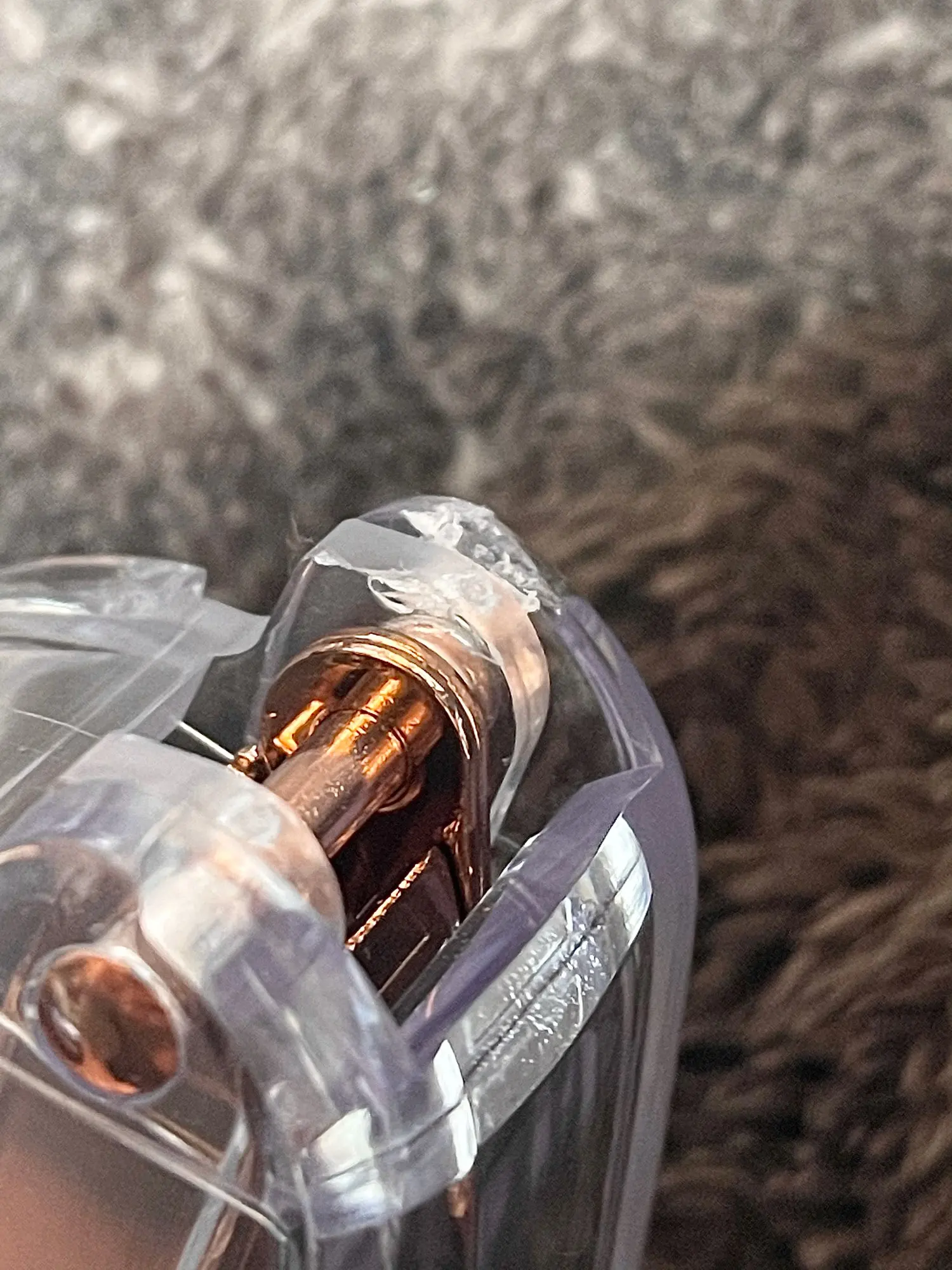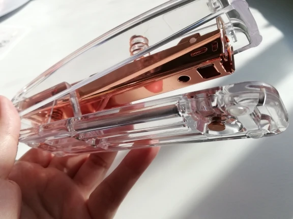На одной стороне металла из розового золота были пятна. Они не снимаются. Другая сторона не имеет пятен и выглядит хорошо. Хороший продукт, не уверен в качестве, он может быть немного более прочным.