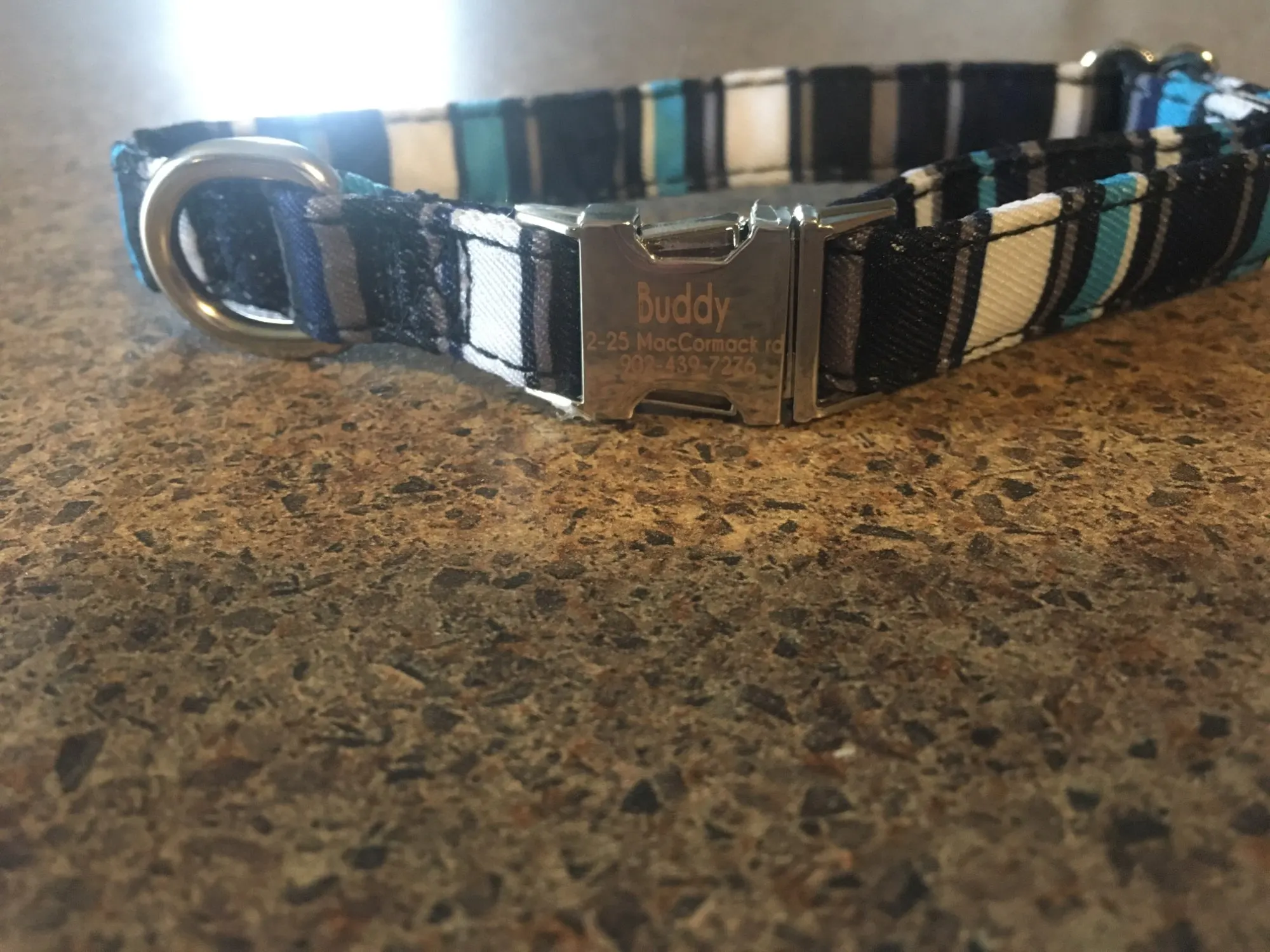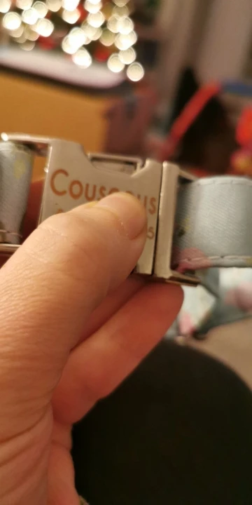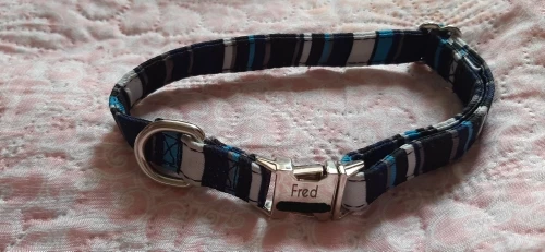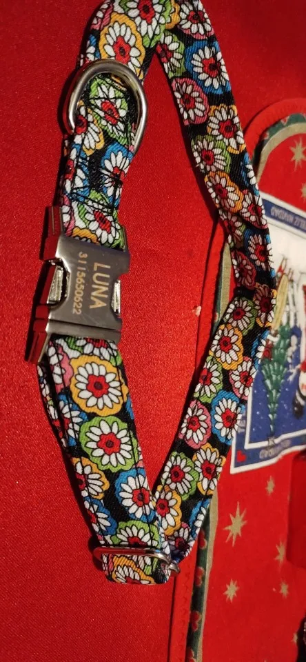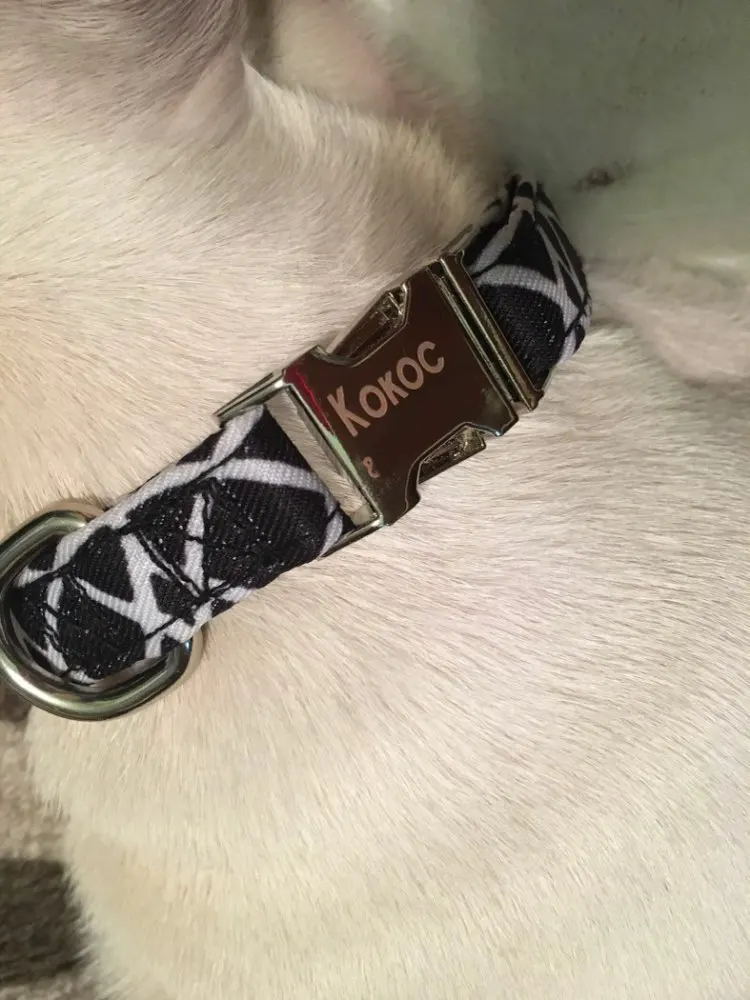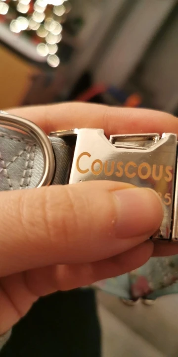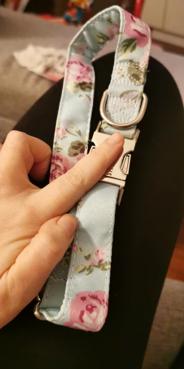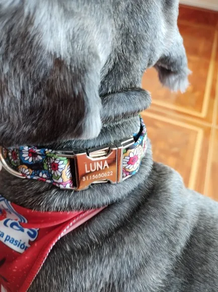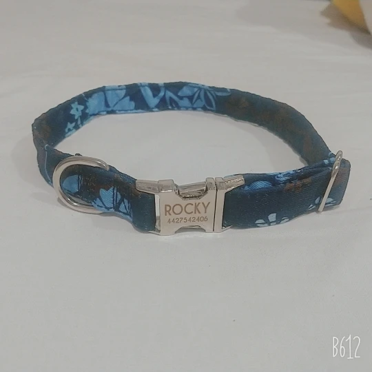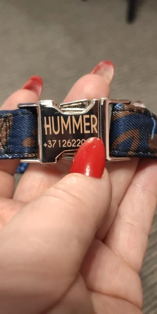 Очень красивый воротник, он выглядит хорошо сделанным и прочным. Зажим изготовлен из металла, и имя было выгравировано правильно.