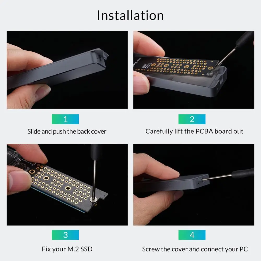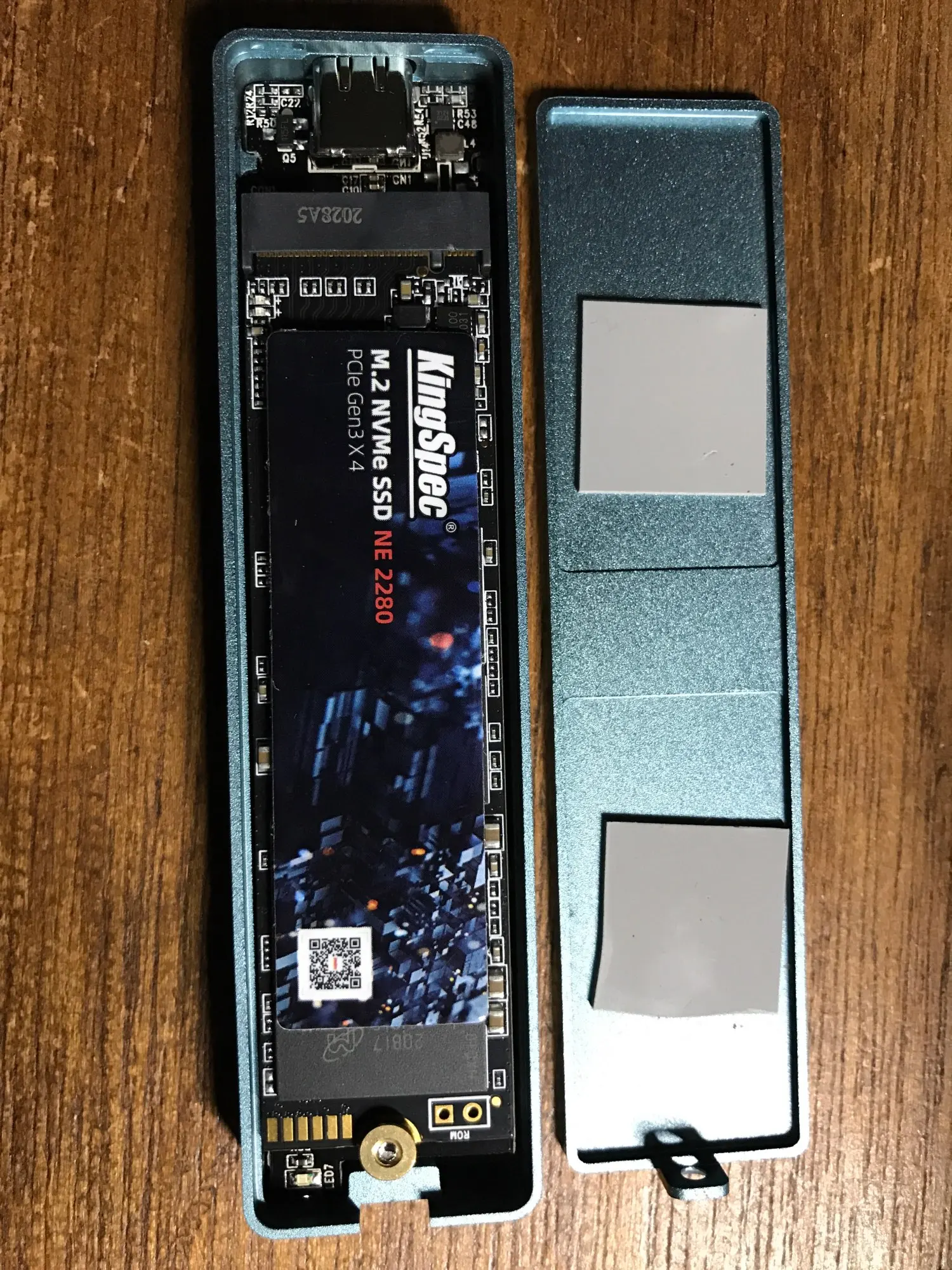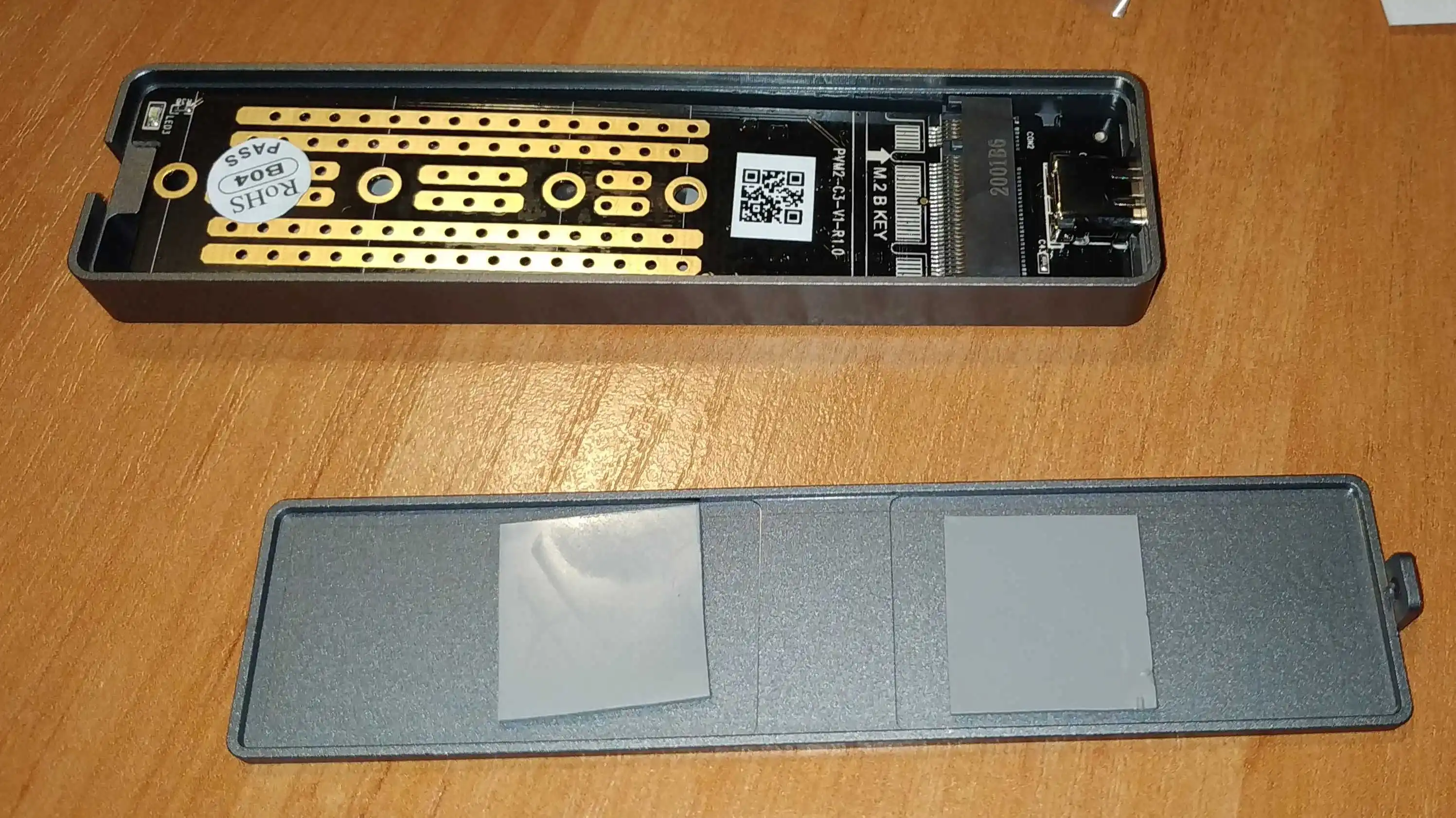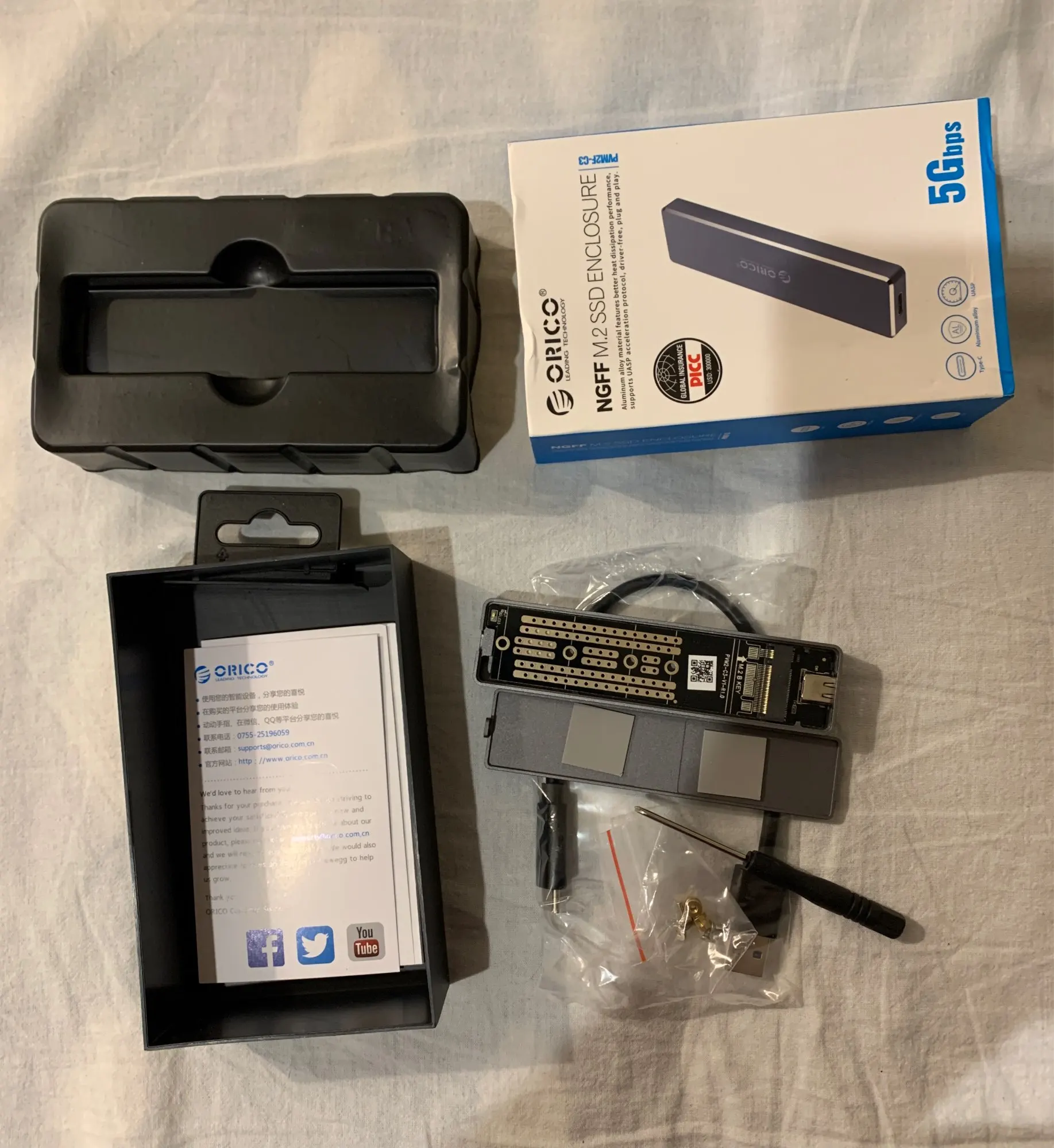 Заказ 11.11, получен 19 ноября. Тяжеленький, корпус - порошковый сплав аллюминия. В комплекте два кабеля коротких, пойдет только для ноута, USB-USB type-c и type-c-type-c, а также отвертка и болтики. Внимание, внтури корпуса две квадратных термопрокладки! Чтобы не грелся сильно, нужна одна длинная термопрокладка на всю длину корпуса. Чипа на плате noname, но надежда на Orico, как на хорошую контору. Я брал корпус для m.2 NMVE, который открвается путем сдвигания верхней крышки назад. Можно болтиком закрепить, можно скотчем и изолентой, чтобы отвертку не таскать с собой. Удобно. Скорость не проверял, так как диск только едет с Китая. Потом дополню.