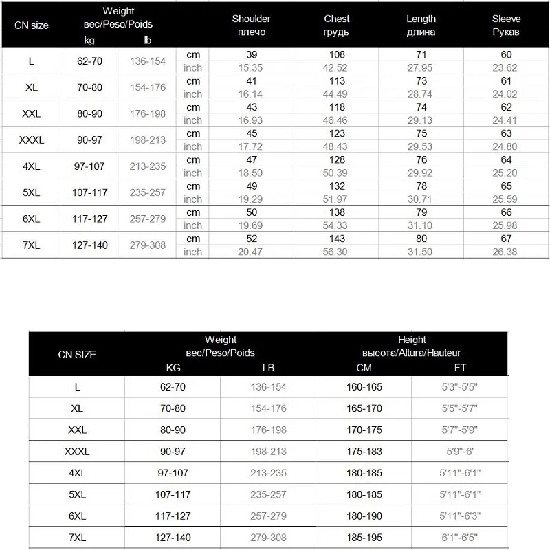 В китайском стилеРазмер ВесВес/ПЕСО/Poids ВысотаВысо/Altura/Hauteur Кг LB См FT L 62-70 136-154 160-165 5'3 "-5'5" XL 70-80 154-176 165-170 5'5 "-5'7" XXL На рост 80, 90 176-198 170-175 5'7 "-5'9" XХХL 90-97 198-213 175-183 5'9 "-6' 4XL 97-107 213-235 180-185 5'11 "-6'1" 5XL 107-117 235-257 180-185 5'11 "-6'1" 6XL 117-127 257-279 180-190 5'11 "-6'3" 7XL 127-140 279-308 185-195 6'1 "-6'5"Указанные выше размеры подходят для большинства людей, но они не являются абсолютными. Если вы хотите размер, который вам подходит лучше всего, Пожалуйста, измерьте грудь, плечо и рукава рубашек, которые вы обычно носите, а затем сравните наши данные о размерах. Для выбора.
