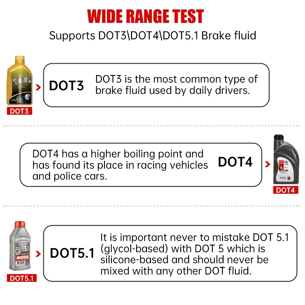 1. ЖК-дисплей, чтобы сообщить вам результаты теста.2. Длинный зонд предназначен для транспортного средства, не нужно брать масло снаружи3. Широкий диапазон испытаний для поддержки DOT3, DOT4, DOT5.1 различных моторных масел.