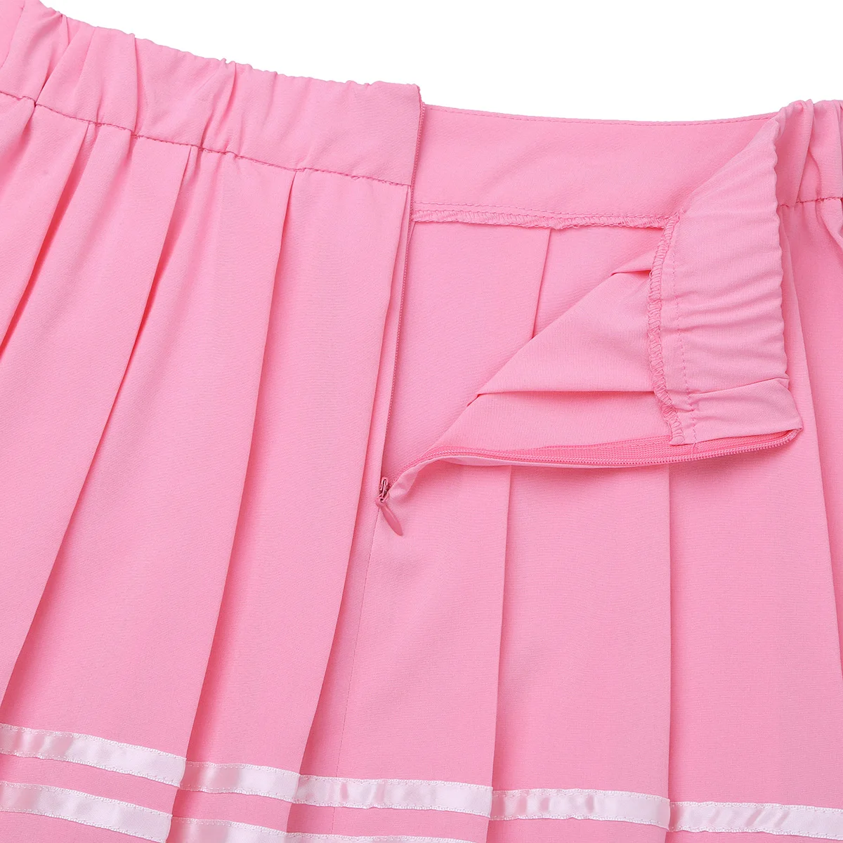 Комбинезон с бантом спереди, полосатым воротником и юбкой. Юбка с эластичной резинкой на талии и застежкой-молнией сзади.