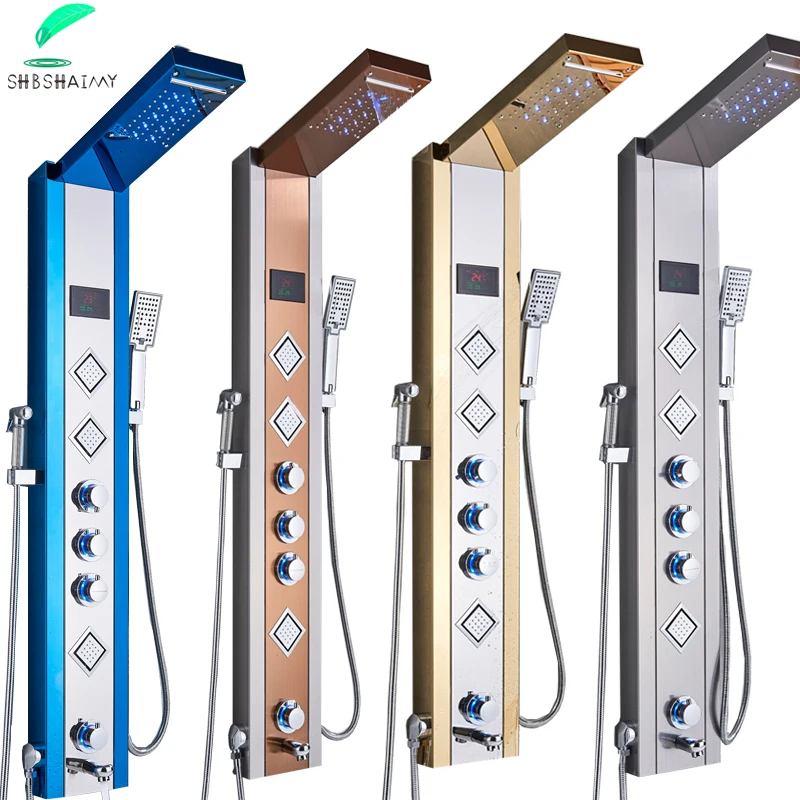 SHBSHAIMY черный Нержавеющаясталь набор для душа кран светодиодный синий душ Панель Multiunfction 6 водопроводных кранов; Jet и биде смеситель для душа