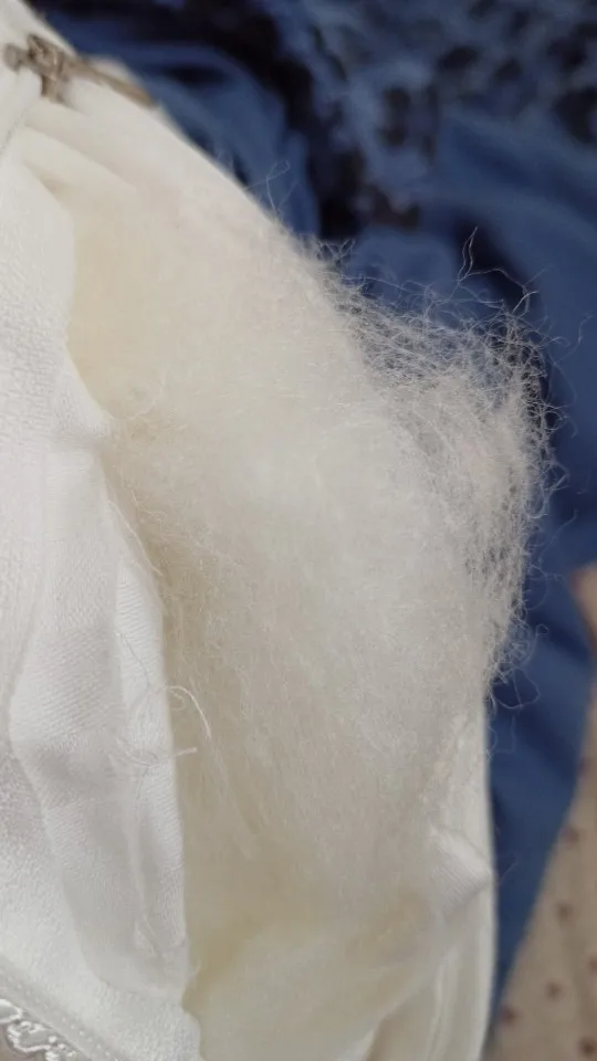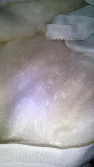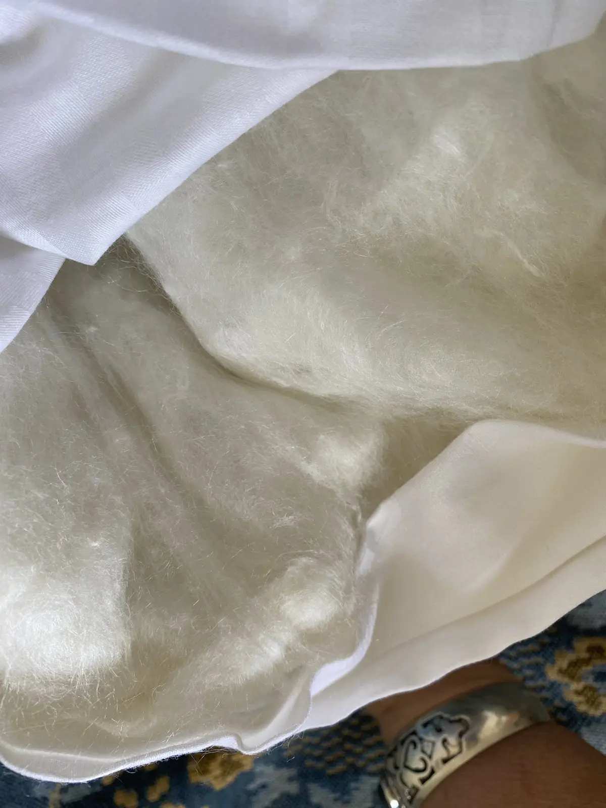 Это шелк внутри, но это короткий штапельный шелк/разрез и, вероятно, смешан с другим волокном. Я разобрал все это и могу пахнуть шелком, увидеть, где плотные пятна от коконов все еще видны, но они не длинные, растягивающийся шелк, как показано на фотографиях процесса в описании.