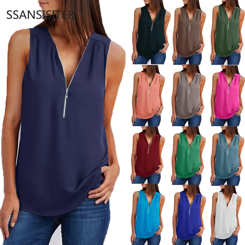 5XL женские шифоновые топы на бретелях, сексуальная туника на молнии с v-образным вырезом, жилет без рукавов, летние свободные повседневные женские футболки, черные топы, Camisa
