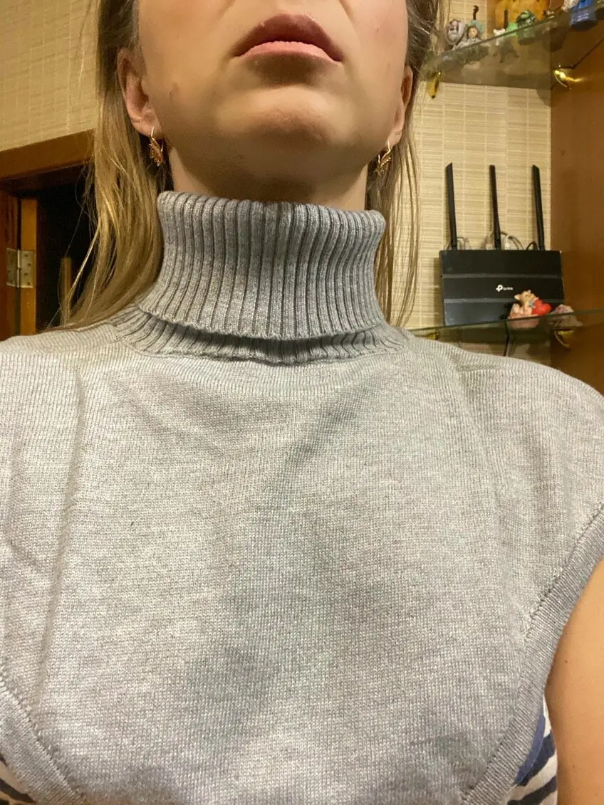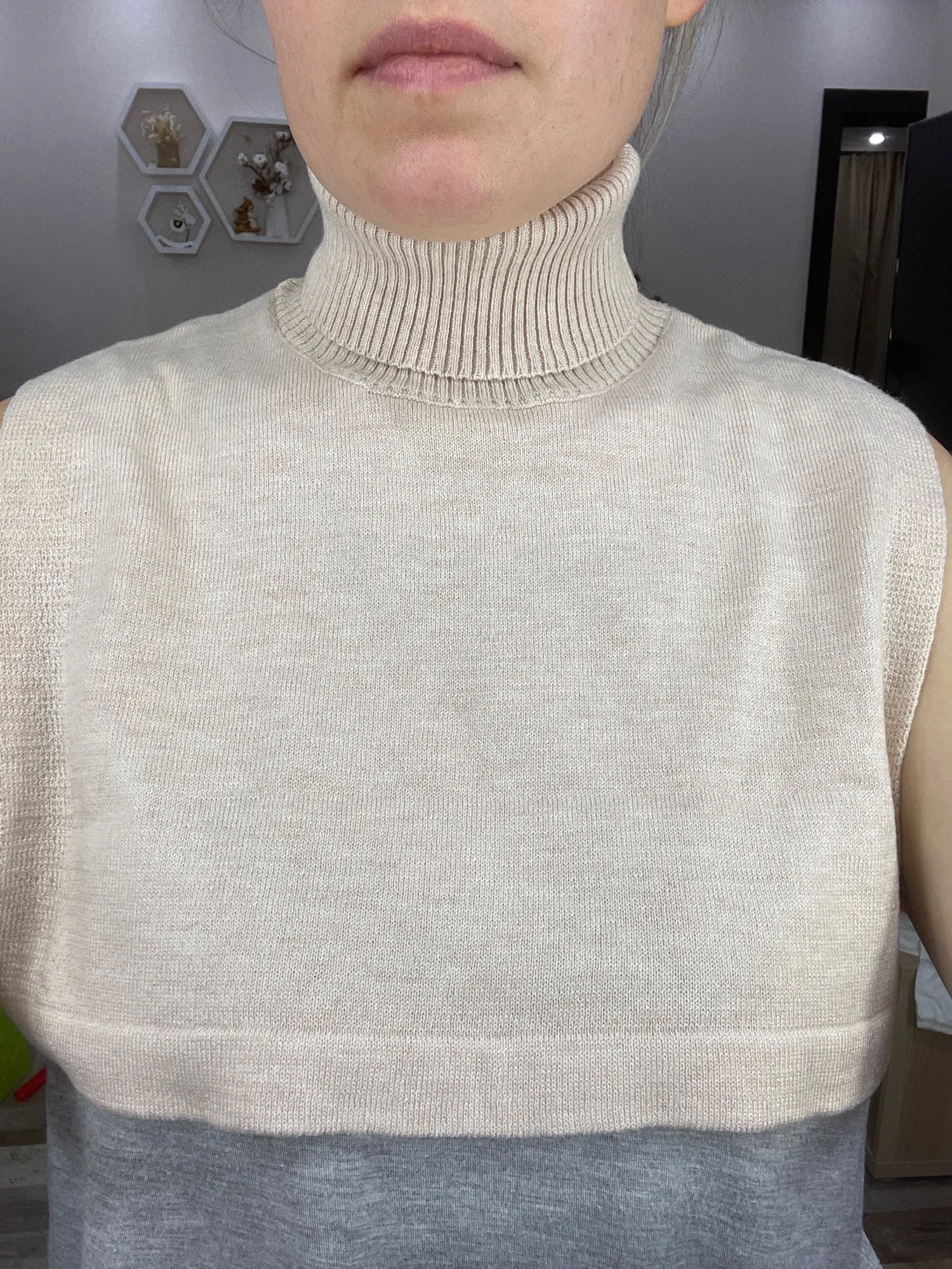 По размеру мне подошёл. Но тонкий. И воротник эластичный не до конца. Растягиваешь его, а потом чувствуешь, что дальше нельзя, шов тянет, хотя сама резинка бы дала ещё возможность растянуть. То есть, если на голове прическа, аккуратно снять не получится. Грудь греет неплохо, хоть и тонкий. Хотела бы такой же, но потолще и с полностью эластичным швом на шее. Пока на улице - 4-7, одеваю его под норковую куртку вместо шарфа. Но, как минусанет посильнее, думаю, замерзну. На осень и тёплую зиму класс.