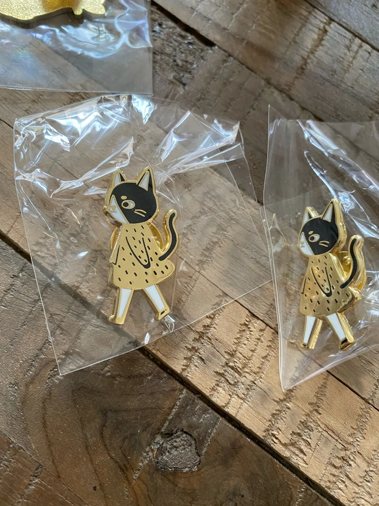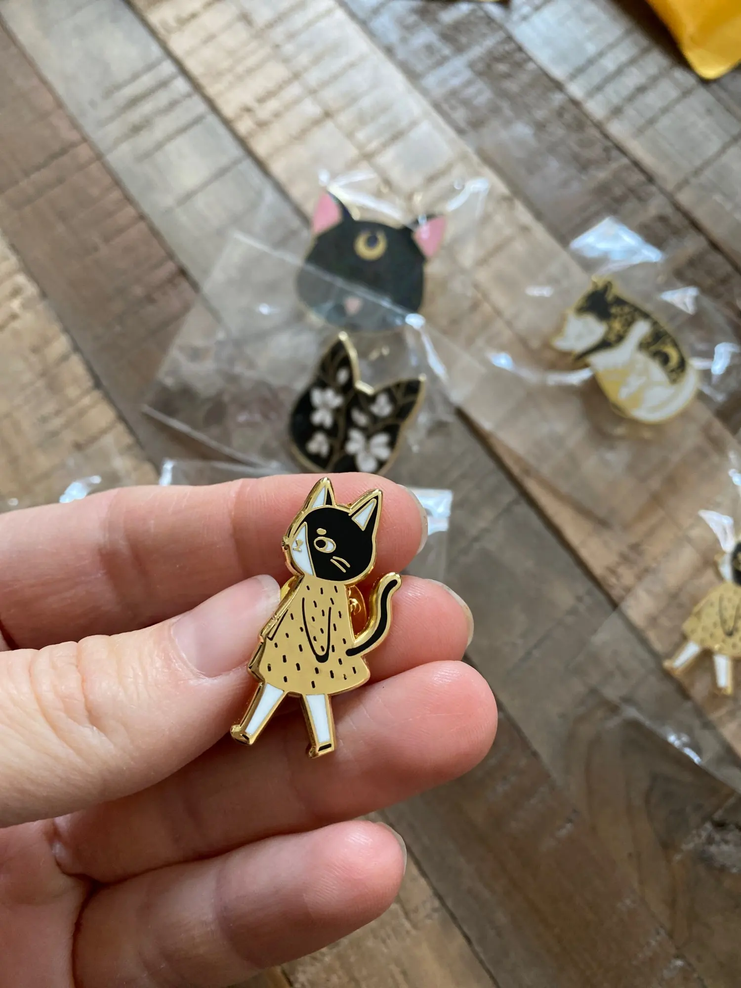 Брошь с эмалью ходячий Кот на булавке Женская, значок в виде животного, золотистая и черная художественная бижутерия для рубашки, жакета, рюкзака, аксессуары