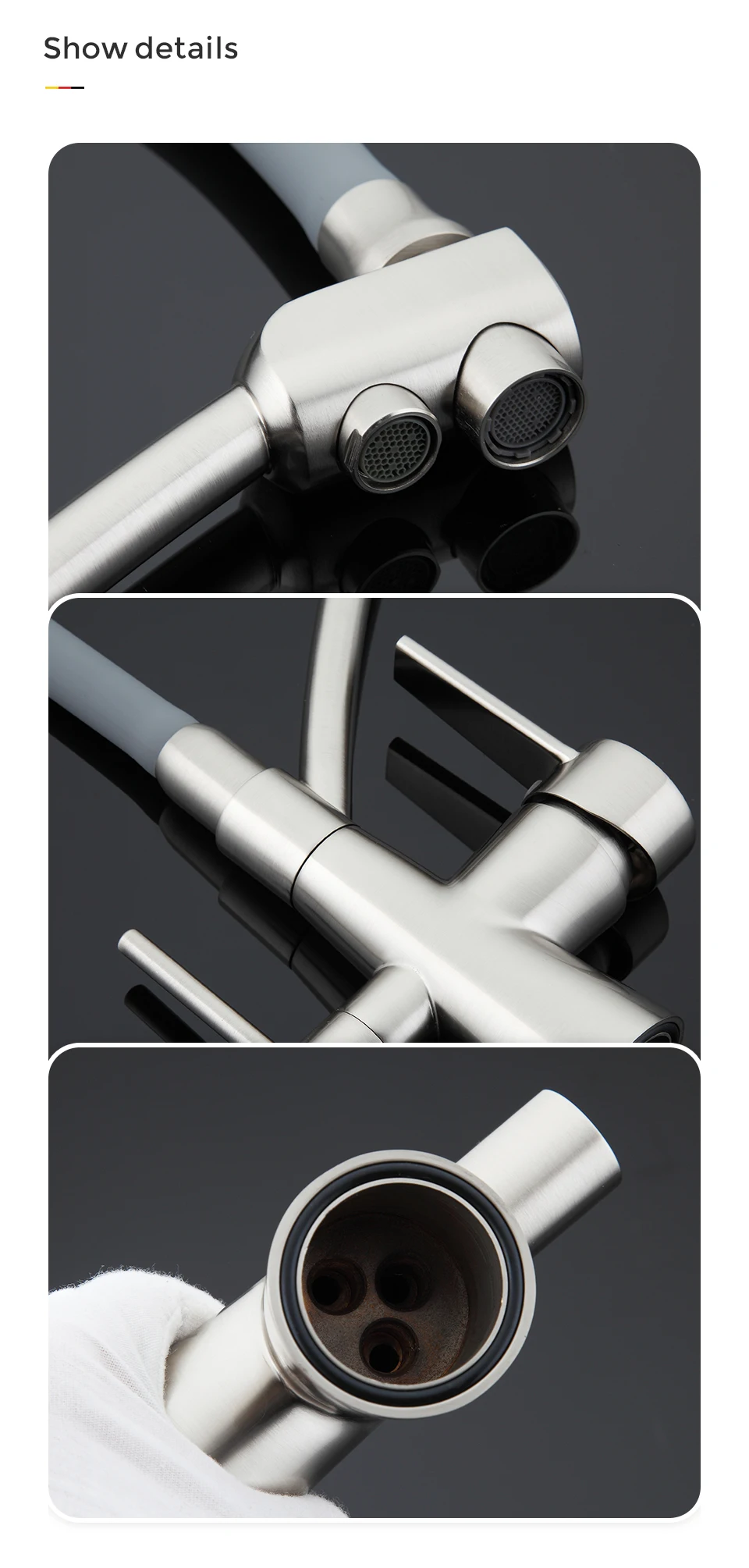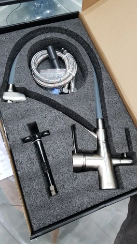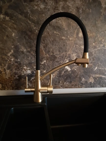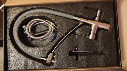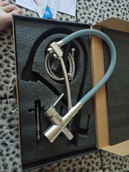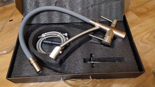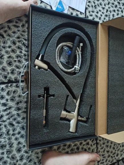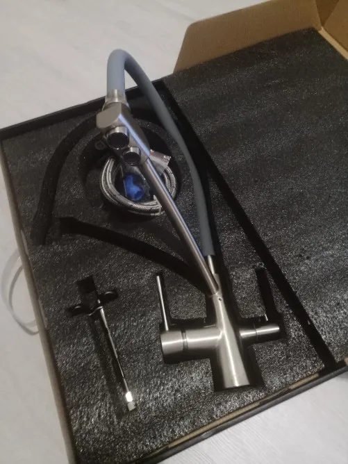 Красивый тяжелый смеситель, все детали плотно подогнаны, силиконовая часть сделана как «душ», очень удобно для мытья посуды и самой раковины. Эта модель имеет встроенный кран для воды из фильтра, что и стало основным мотиватором покупки. Приехал курьером сдэк примерно за неделю, спасибо, все устроило)
